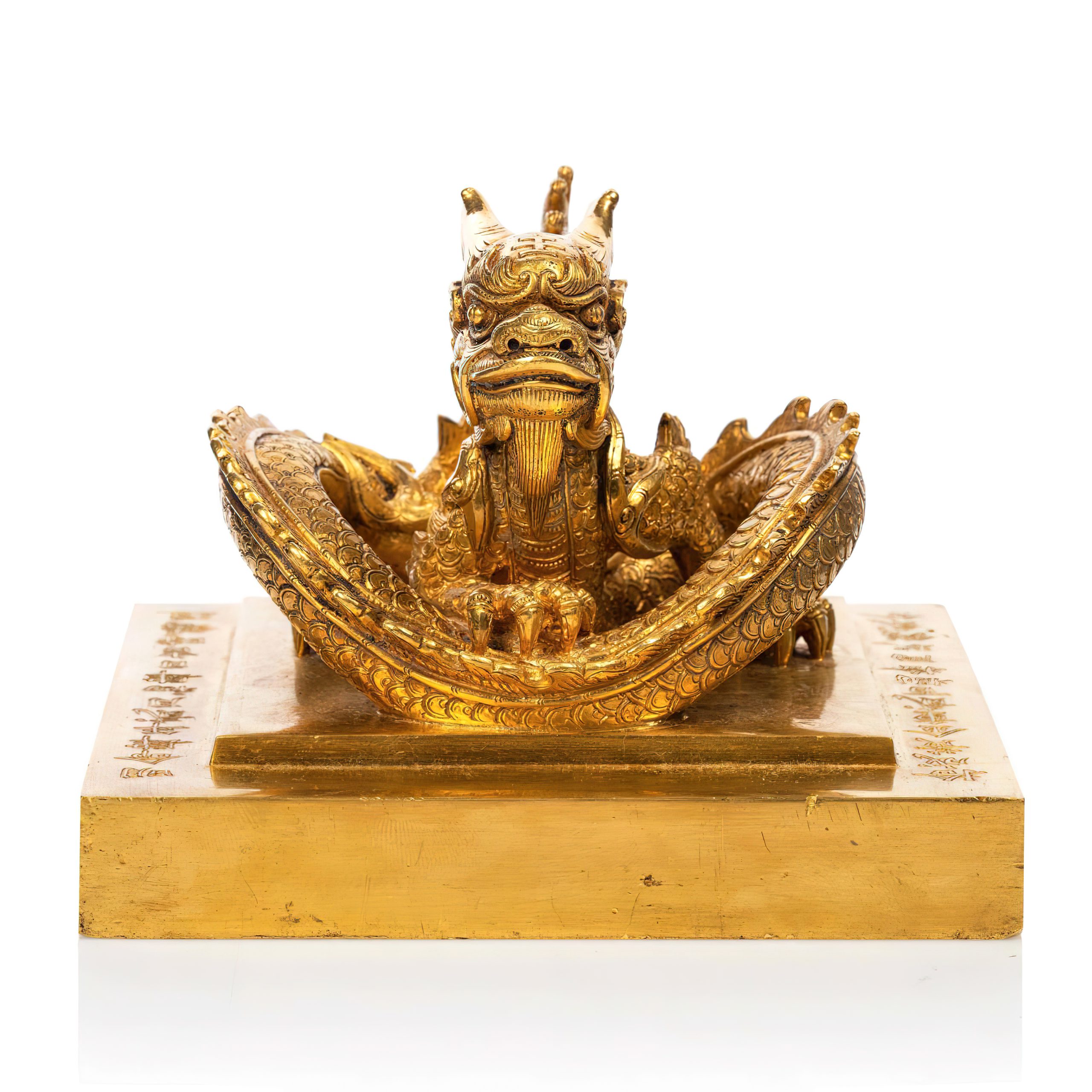Đây là một chiếc ấn có hình vuông, quai ấn là một con rồng uốn khúc, đầu ngẩng cao, mắt nhìn thẳng về phía trước. Đỉnh đầu rồng khắc hình chữ “Vương”; kỳ (vây lưng) dựng đứng, đuôi cũng dựng đứng, vây đuôi uốn cong về phía trước, 4 chân rồng đúc rõ 5 móng, tư thế chống chân xuống mặt ấn rất vững vàng. Mặt dưới của ấn khắc 4 chữ triện “Hoàng Đế Chi Bảo”. Mặt trên của ấn, hai bên quai khắc nổi 2 dòng chữ: “Minh Mạng tứ niên nhị nguyệt sơ tứ nhật cát thời chú tạo” (Đúc vào giờ tốt ngày mồng 4 tháng 2 năm Minh Mạng thứ 4, tức ngày 16/3/1823), và “Thập thành hoàng kim, trọng nhị bách thập lạng cửu tiền nhị phân” (Đúc bằng vàng, trọng lượng 280 lạng 9 chỉ 2 phân – tức nặng 10,78kg).