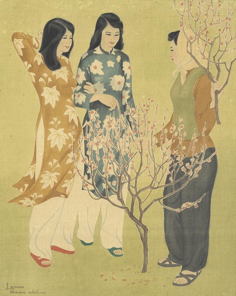 Trong thời gian đó, hầu hết các bức tranh bìa, phụ bản của tạp chí, đặc biệt là báo Phong Hóa và Ngày Nay, được thực hiện bởi các họa sĩ thế hệ mới. Từ đó, nhiều bức tranh thiếu nữ chơi xuân trong những tà áo dài thướt tha đã được ra đời. Bức tranh lụa vẽ người phụ nữ trong cảnh xuân sớm nhất có thể tìm thấy được là bức Ngày Tết của danh họa Trần Văn Cẩn, in trong cuốn Những trường Mỹ thuật Đông Dương (Les écoles d’art de l’Indochine, 1937, NXB. Imprimerie D’ExtrêmeOrient tại Hà Nội). Nếu so sánh với các bức tranh chủ đề thiếu nữ đi chợ Tết của họa sĩ Lương Xuân Nhị và Nguyễn Tiến Chung, thì cô gái trong bức tranh này có sự giao tiếp với người bán hoa một cách thân mật hơn. Đây có lẽ cũng là bức tranh hiếm hoi ta thấy một cô gái mặc áo dài quay lưng lại phía người xem, còn người nông dân bán hoa được thể hiện rõ khuôn mặt với sự chân tình dành cho thiếu nữ, đồng thời người nông dân cũng trở thành nhân vật chính của tác phẩm.