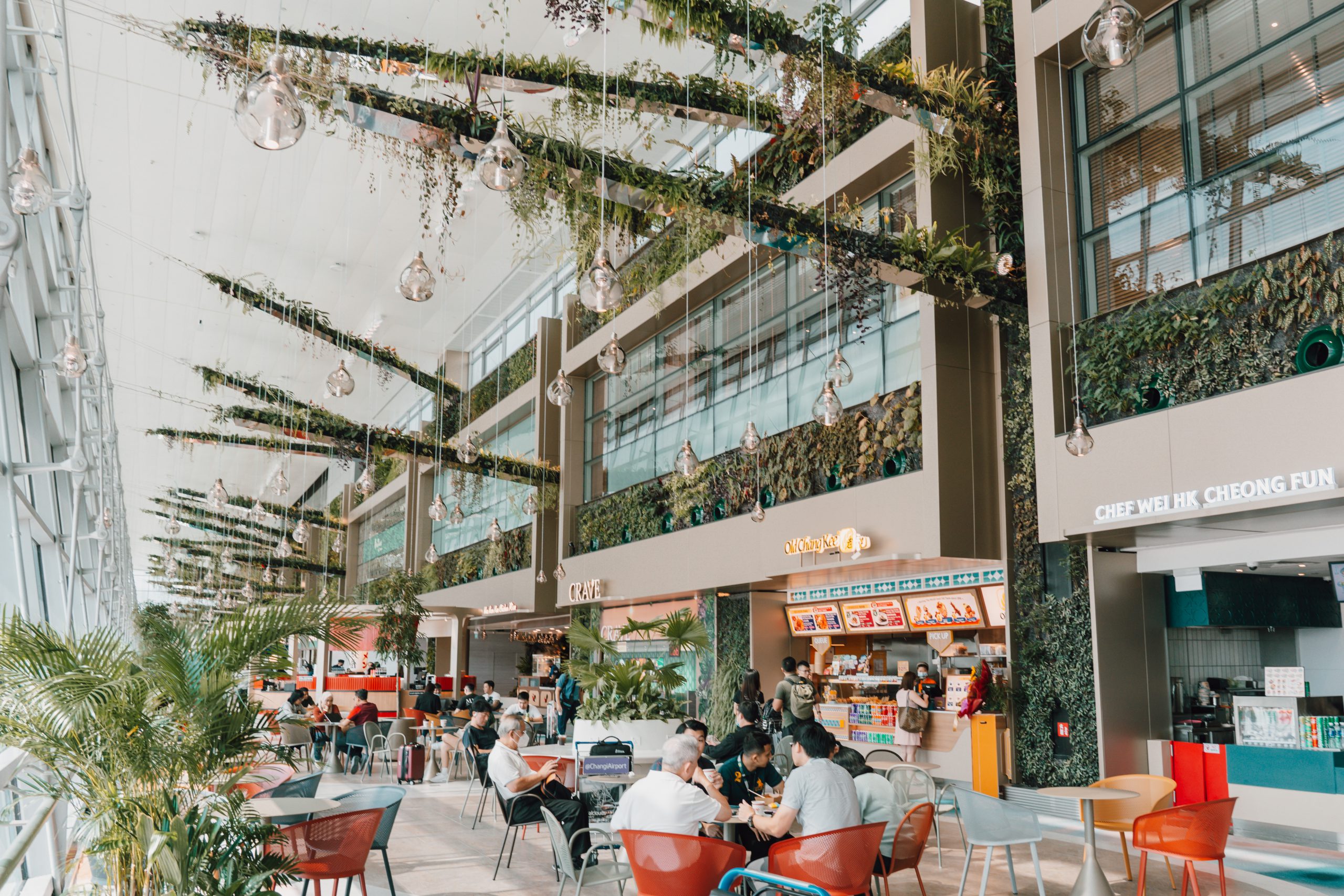 Trong thời gian quá cảnh, hành khách cũng có thể ghé qua nhà hàng Gourmet Garden để thưởng thức ẩm thực địa phương và quốc tế trong khi chờ đợi. Nhà hàng ngập tràn sắc xanh của cây cỏ từ khu vườn treo, mang đến một không khí thanh bình. Gourmet Garden còn nằm ngay sát tường kính nhìn thẳng ra sân đỗ máy bay. Thực đơn của Gourmet Garden rất đa dạng – thực khách vừa có thể thưởng thức phở Việt Nam, vừa trải nghiệm ẩm thực Singapore, vừa ngắm nhìn những chiếc máy bay từ từ lăn bánh trên đường băng.