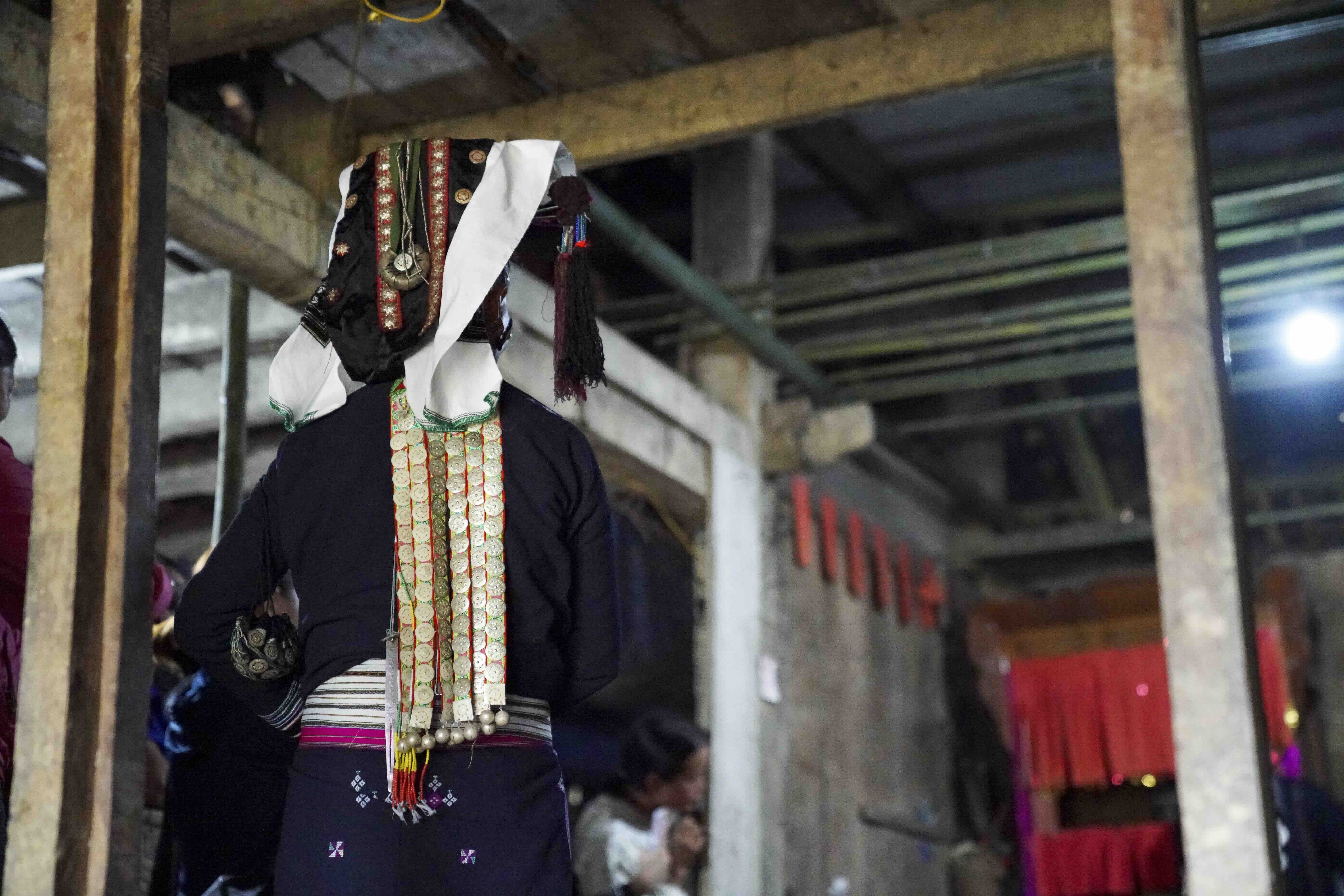 Cổ áo phía sau treo những dải vải đính đồng bạc