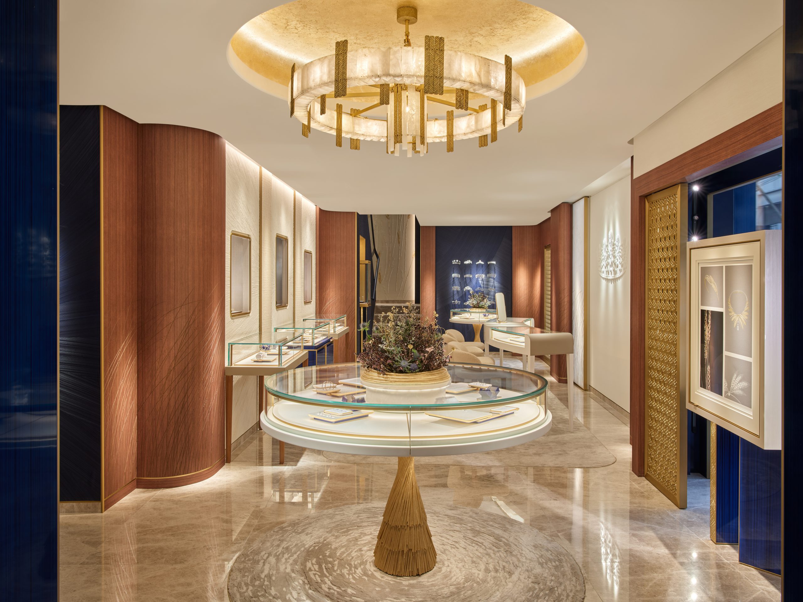 Boutique Chaumet có lối kiến trúc thoáng đãng và ngập tràn ánh sáng. Mỗi bản vẽ gouache, nhành lúa mì dát lá vàng cúi đầu trong gió, phù điêu nổi, mô-típ tia sunburst chạm khắc… lại khiến không gian boutique thêm tinh tế và đắt giá. Được thương hiệu trân trọng như một viên ngọc quý của châu Á, không gian duplex của boutique hé mở một góc Paris lộng lẫy, duyên dáng và xa xỉ giữa lòng Hà Nội.