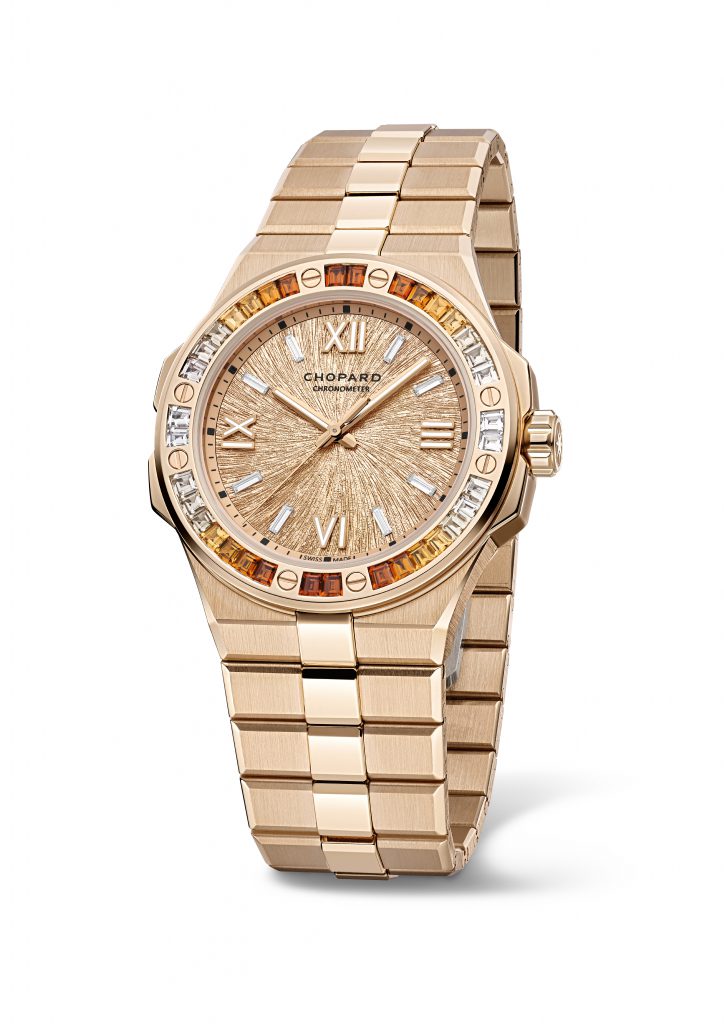 Năm nay, “đại bàng đỉnh tuyết” sải cánh tới thành phố trên sa mạc Dubai trong sự kiện Tuần lễ Đồng hồ, với bốn phiên bản Summit đính đá quý rực rỡ hoàn toàn mới. Những mẫu đồng hồ đính đá quý giác cắt baguette trên viền bezel khẳng định năng lực và di sản chế tác kim hoàn thượng thặng của Chopard. Golden Peak vàng vàng tái hiện đỉnh núi cùng tên dưới sắc tím chạng vạng của sapphire; Vals Grey vàng trắng là rặng đá quarzite vùng Vals xen kẽ đá tsavorite như sương giá trên những rặng thông xanh. Pink Dawn vàng hồng mang những tia nắng sớm từ đỉnh núi xuống mặt đất với dải đá spessartite cam.
