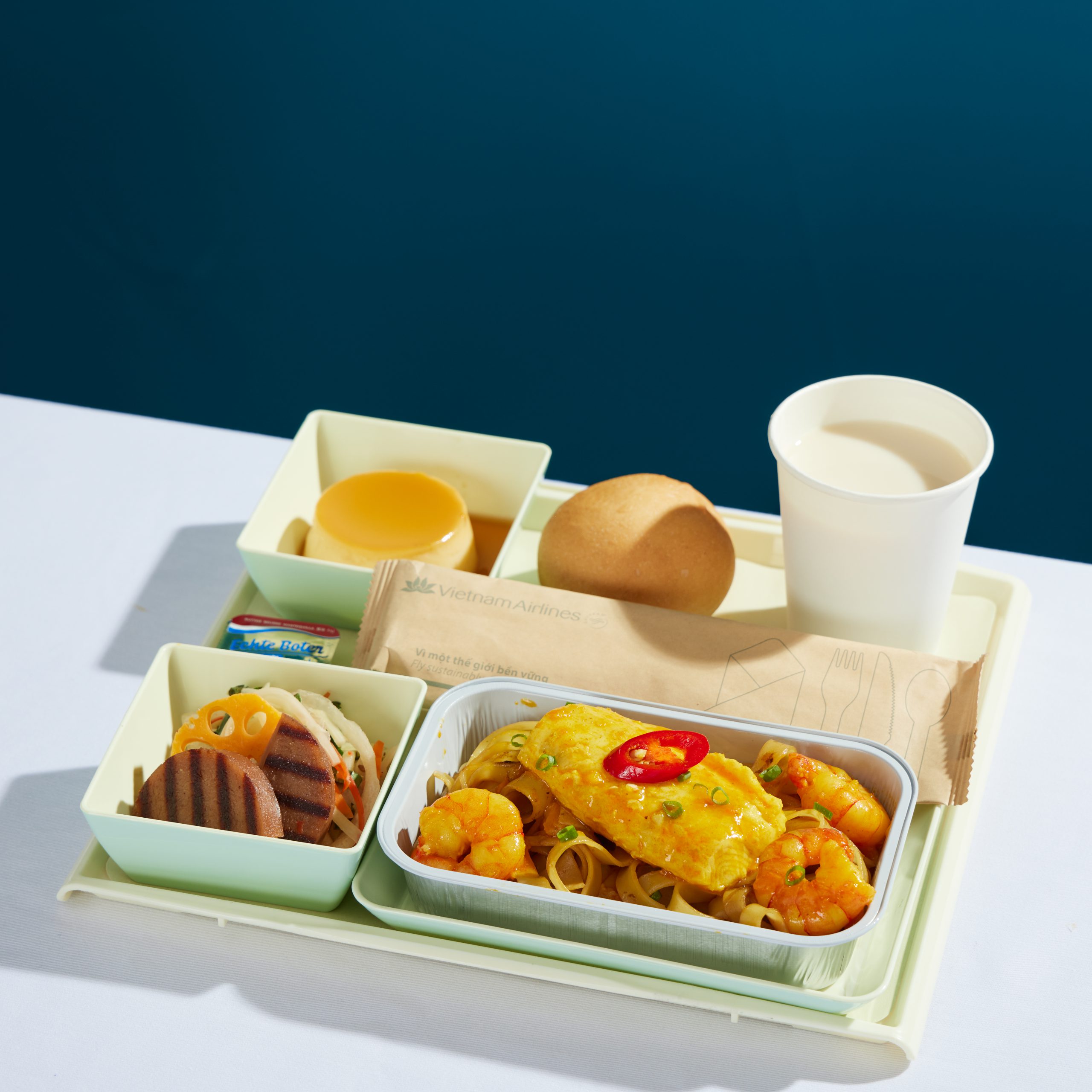 Hãng cũng hợp tác cùng USSEC – Hội đồng Xuất khẩu Đậu nành Hoa Kỳ thiết kế các khay ăn tốt cho sức khỏe và thân thiện với môi trường (“Healthier and more Sustainable Meal”). Mỗi suất ăn sẽ được tăng cường rau xanh và các nguyên liệu có nguồn gốc từ thực vật, sử dụng các nguyên liệu và cách chế biến có lợi cho sức khỏe. Trong đó, nguyên liệu cá và hải sản đạt tiêu chuẩn ASC – chứng chỉ xác nhận cấp quốc tế đối với thủy sản được nuôi có trách nhiệm, giảm thiểu tối đa tác động xấu đến môi trường, hệ sinh thái, cộng đồng dân cư. Đồng thời kết hợp với các nguyên liệu được chế biến từ nguồn đậu nành Hoa Kỳ được canh tác bền vững.