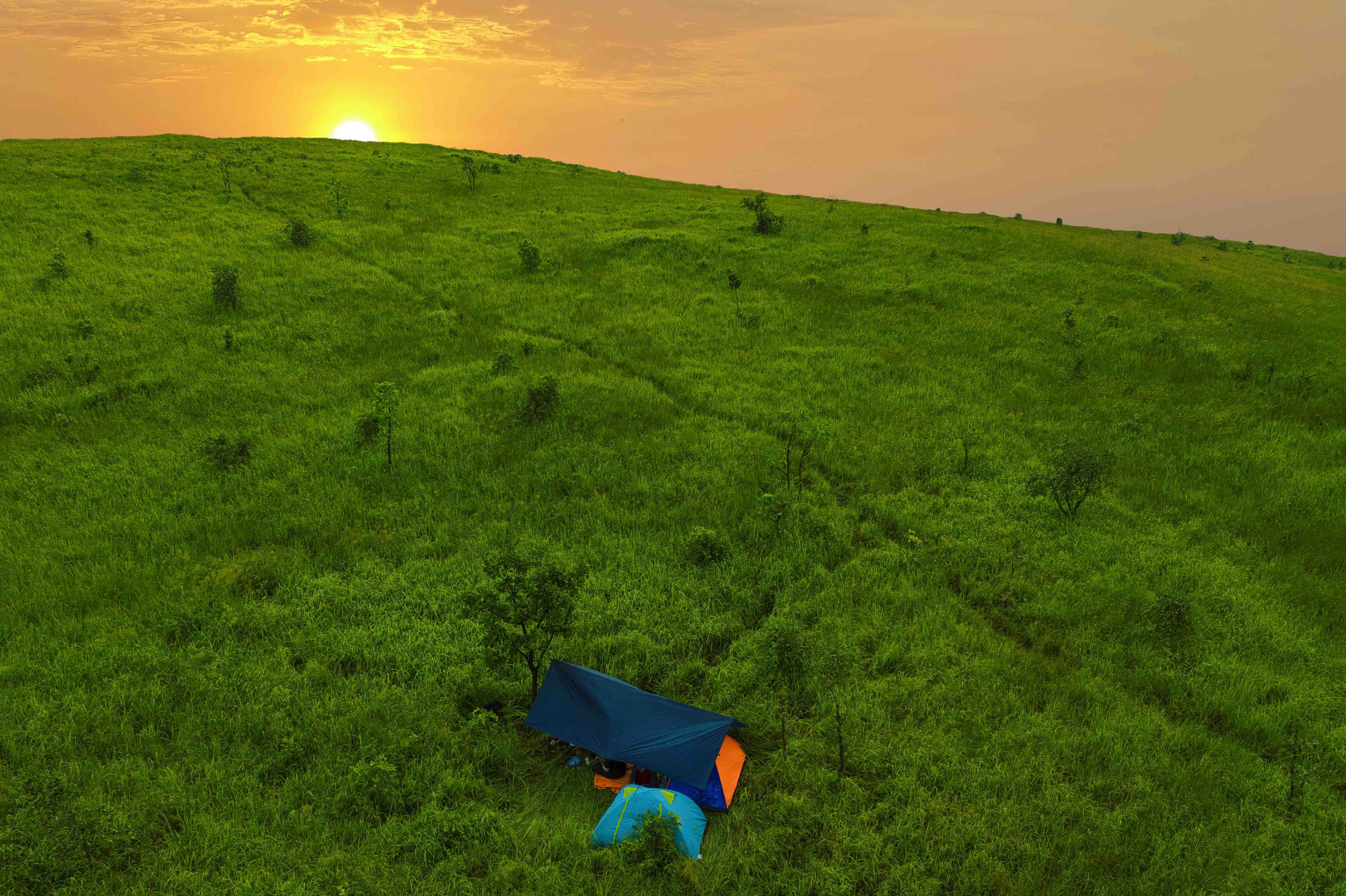 Chúng tôi hạ trại nơi đỉnh của một quả đồi cao. Hành trình đi bộ băng rừng vượt dốc tương đối dài nhưng chẳng có chút mệt mỏi nào làm khó chúng tôi, bởi những trải nghiệm tuyệt vời dọc đường mang lại quá nhiều cảm xúc thăng hoa. Hoàng hôn buông xuống, những đỉnh núi của dãy Trường Sơn xa xa bao bọc lấy thảo nguyên Ea Sol thanh bình, ánh đèn từ thị trấn Ea Drăng dưới kia hắt lên trời đêm một vầng sáng lung linh.