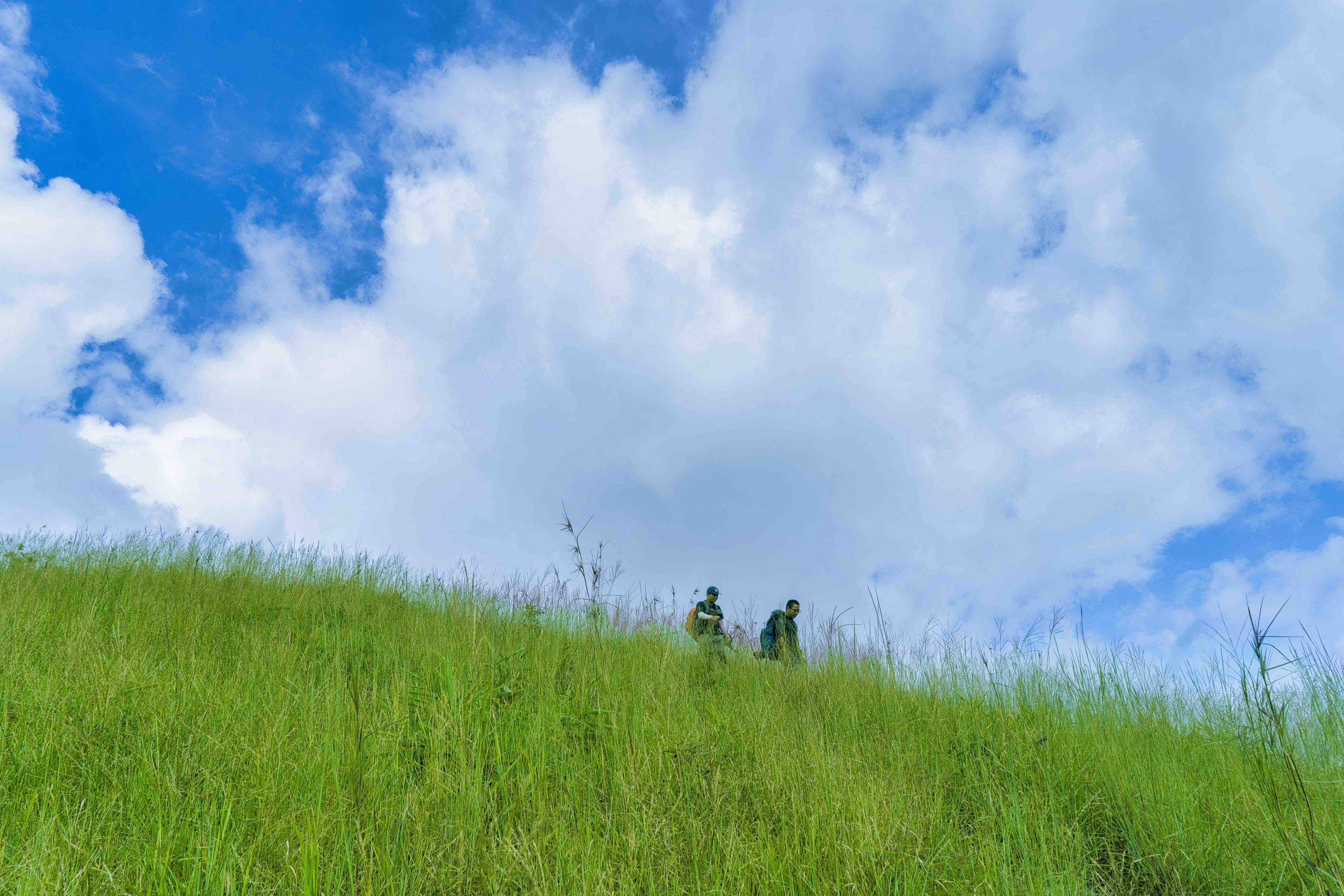 Vượt qua cánh rừng, không gian bừng mở trước mắt chúng tôi: màu xanh ngời của vương quốc cỏ. Một ma trận đồi cỏ nhấp nhô xanh mướt đầy hấp dẫn và huyền hoặc. Gió cao nguyên mơn man trên đồi cỏ, đôi khi gió ve vuốt hơi mạnh tay làm lũ cỏ xanh cao ngang nửa thân người xô rạp xuống, rồi lại bật thẳng lên tha thướt, mềm dẻo như những cô gái Tây Nguyên trong vũ điệu giữa đại ngàn, vừa hoang dại, vừa cuốn hút. Từ đầu hành trình, chúng tôi chưa bao giờ cảm thấy mệt mỏi, bởi đại ngàn và thảo nguyên cứ nối nhau đưa chúng tôi từ ngạc nhiên này đến thú vị khác. Đi trên những con đường mòn giữa bạt ngàn cỏ xanh cao lao xao gợn sóng, đôi khi tôi cố tình chậm lại phía sau để ngắm các bạn đồng hành thong thả bước trên sườn đồi phía trước – như những người đang đi ngang trời.