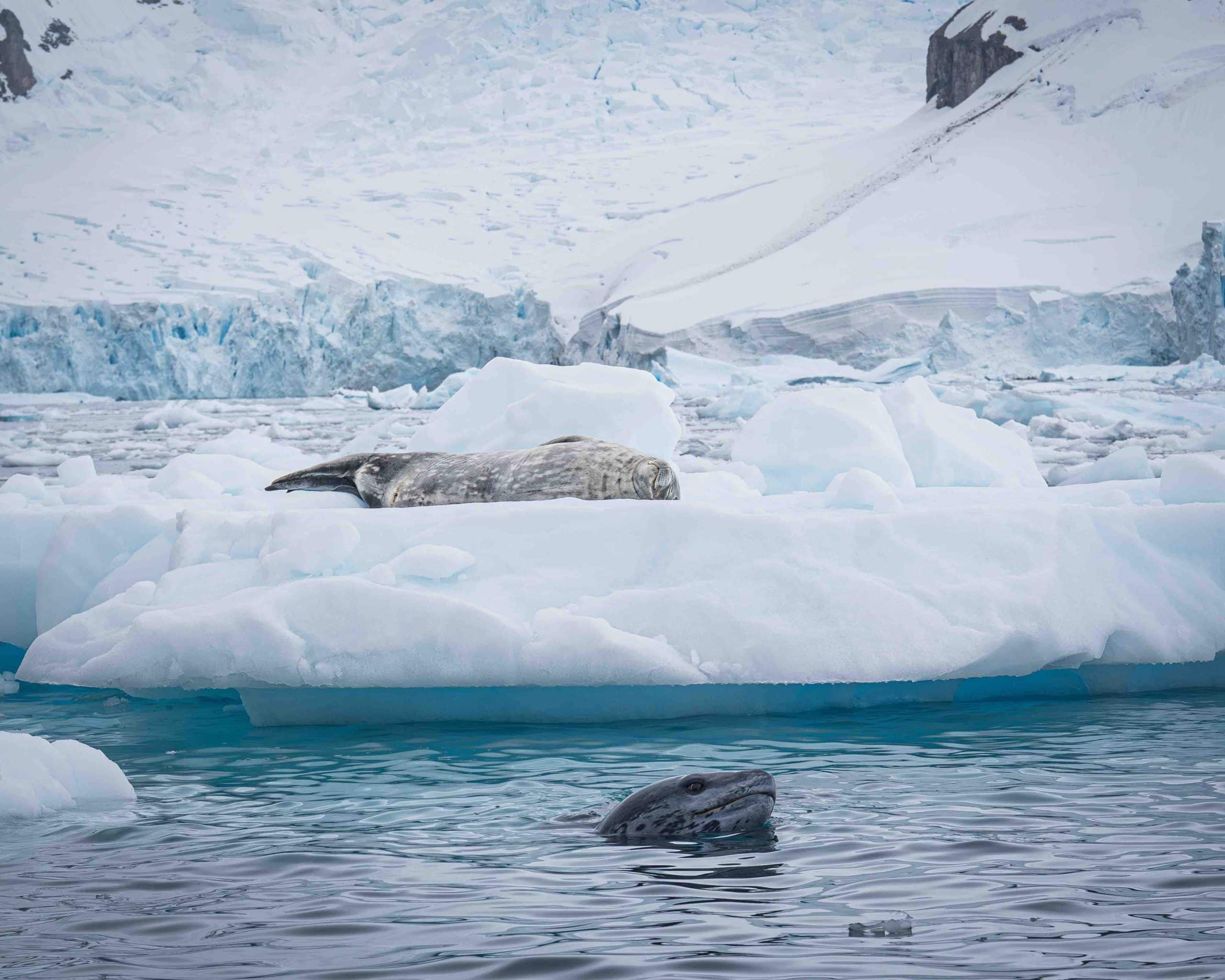 Hải cẩu Weddell nằm ngủ trong khi hải cẩu báo đang rình rập bên dưới các tảng băng
