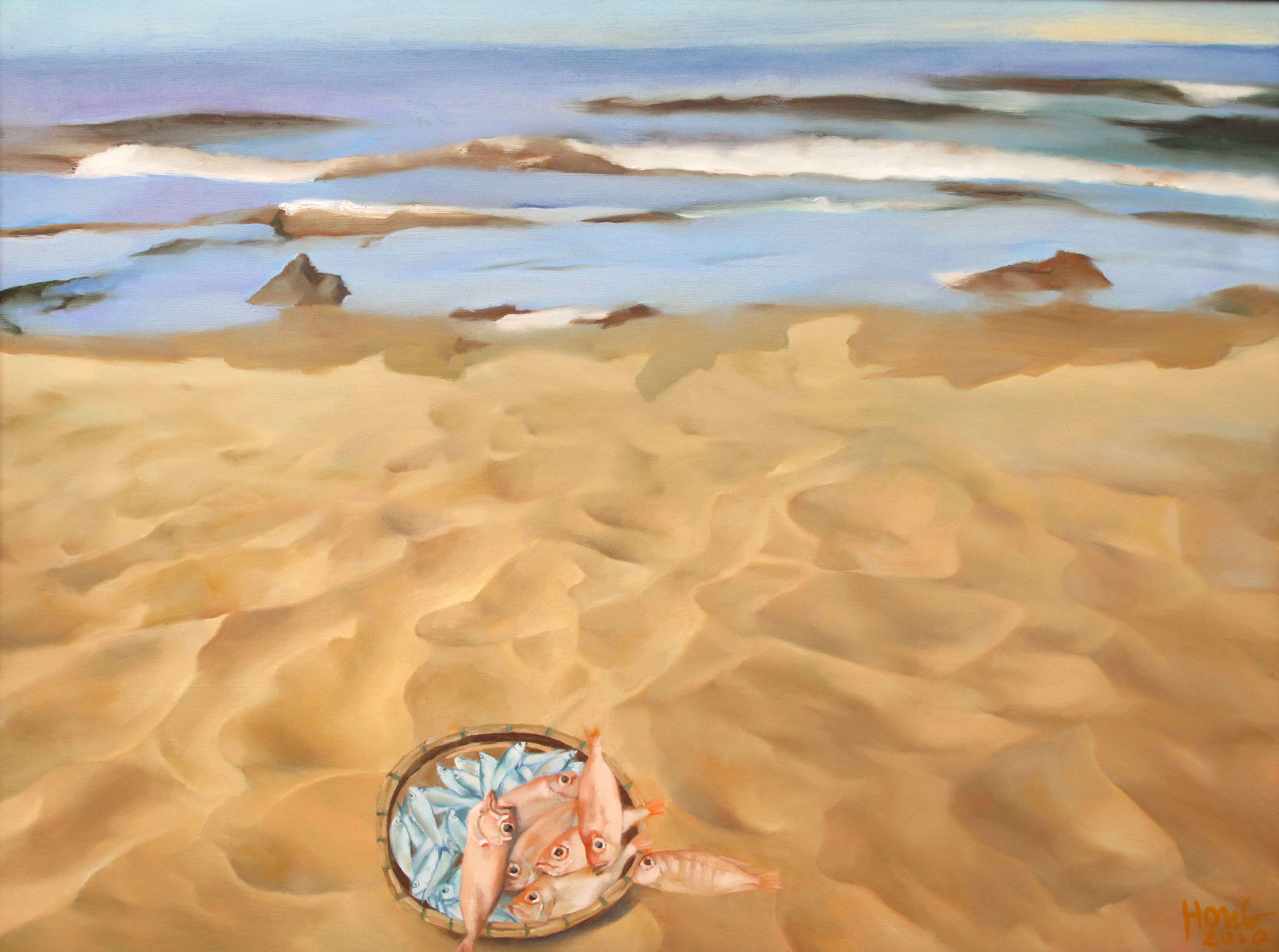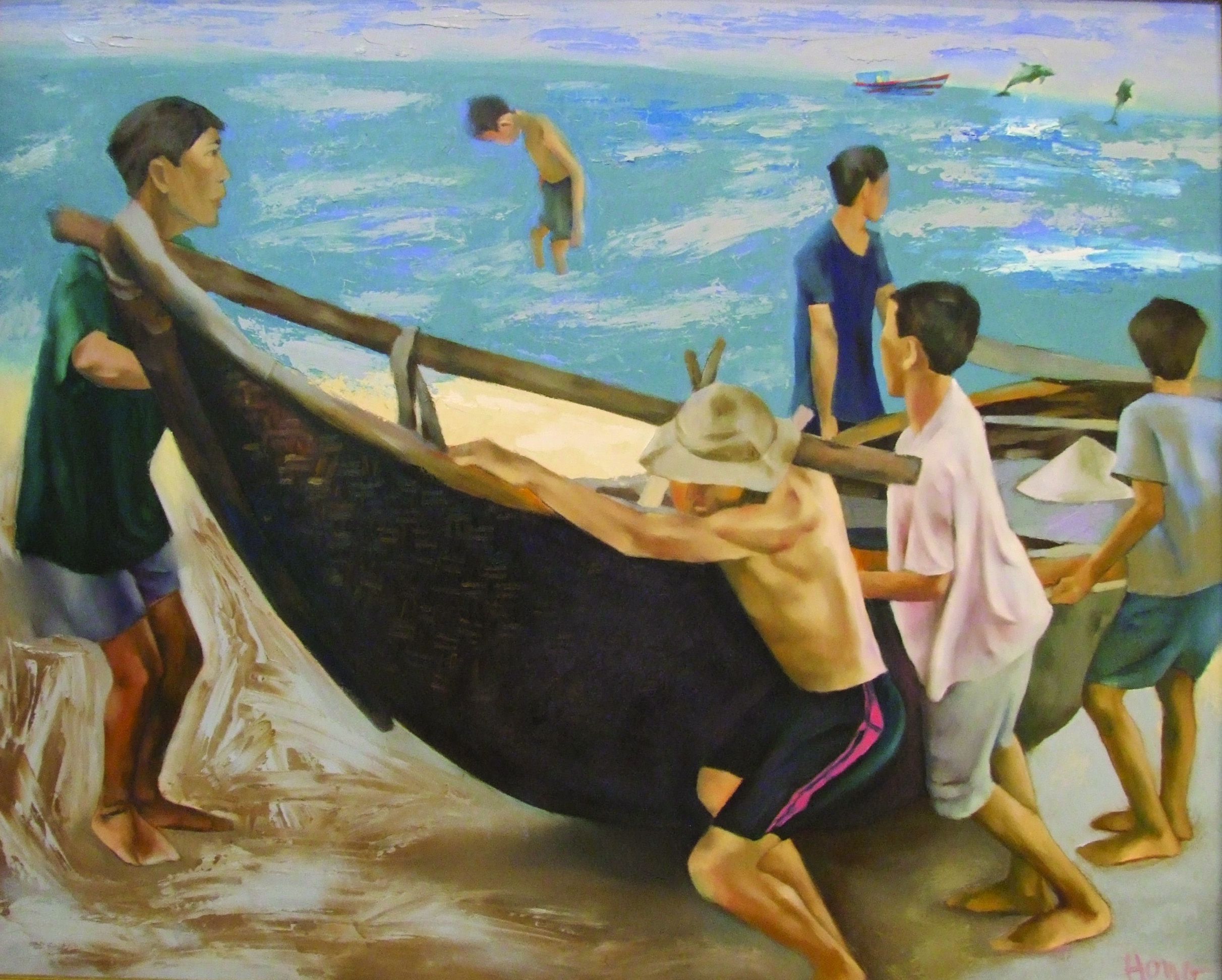 Hơn 10 năm nay, họa sĩ Đoàn Hồng chỉ dành thời gian để vẽ về một đề tài duy nhất, đó là cuộc sống ven biển. Chỉ nhìn vào mặt cát cũng đã thấy hiện lên nỗi vất vả, nhọc nhằn, lam lũ… Không thể có chân dung nào hay hơn thế về cuộc sống biển |