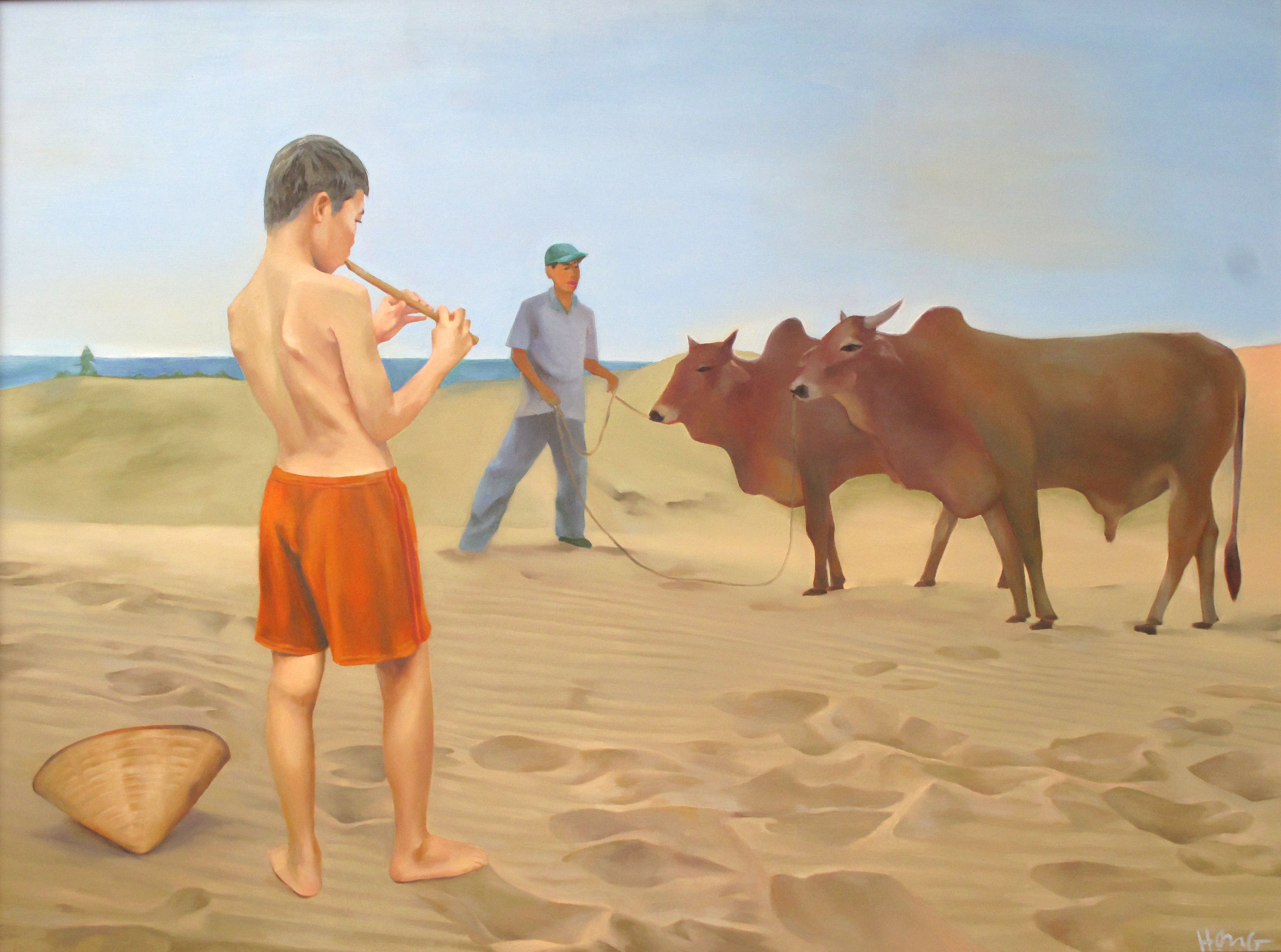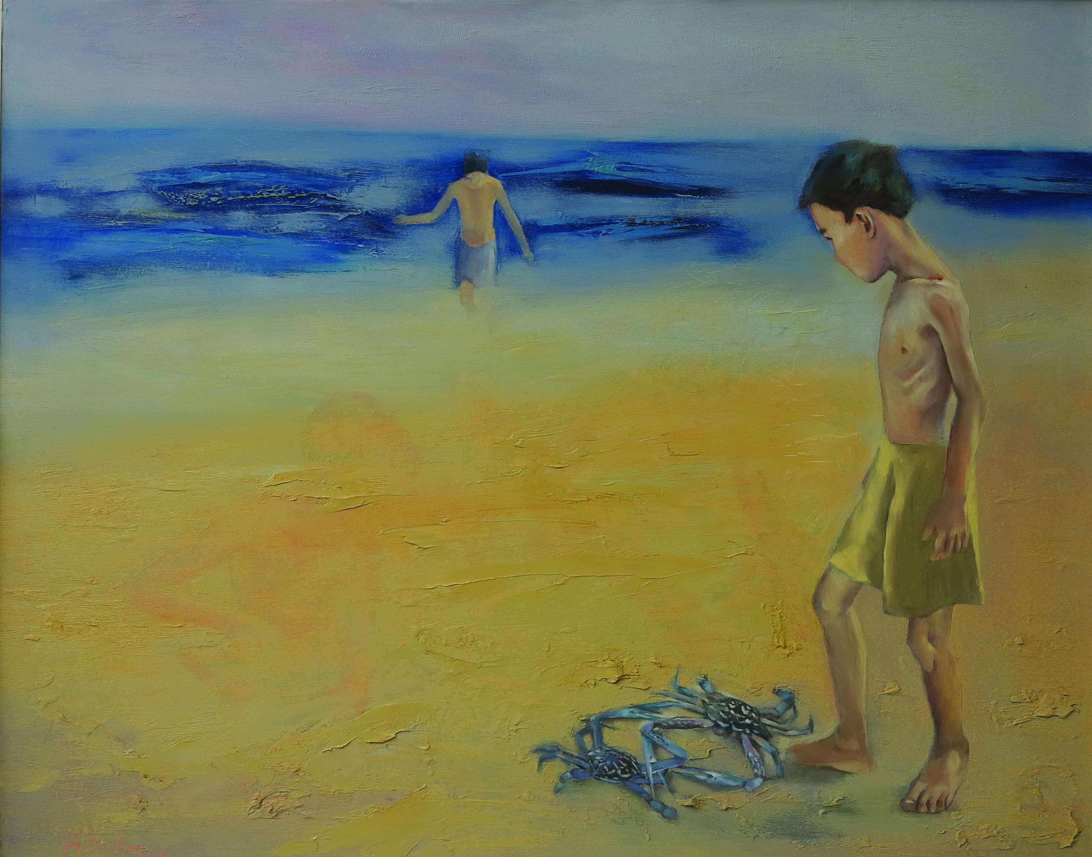 Bên cạnh cái nắng gió rát mặt, Đoàn Hồng cũng tìm được cái phiêu bồng của không gian biển để nhớ lại tuổi thơ. Trong nhiều tranh, anh thả những đám mây thũng thẵng, mặt biển xanh mơ màng và con sóng mơ hồ với làn bọt trắng, như những vì sao mờ trên dải ngân hà. Rồi những đứa trẻ vui đùa vô tư lự, những con ghẹ còn tươi sau cuộc đánh bắt. Đó là những sinh hoạt ven biển, chẳng ai giống ai. Chỗ này người lo âu chờ đợi phấp phỏng, chỗ kia lũ trẻ vô tư chạy lăng quăng với cây sáo nhỏ trên tay… |