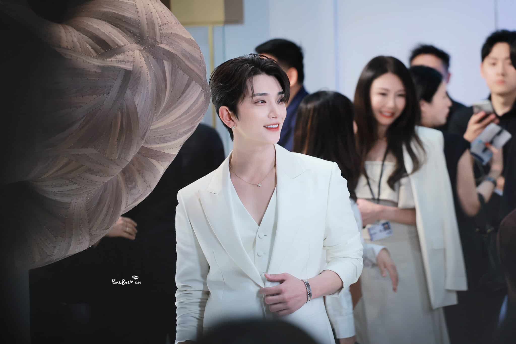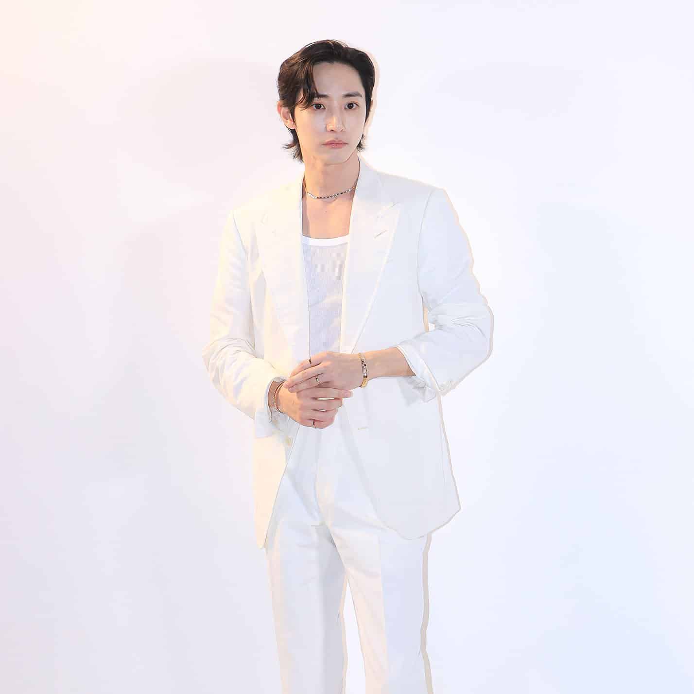 Tông trắng là sự lựa chọn của nam diễn viên Lee Soo-hyuk bên cạnh những mẫu trang sức Bee My Love phong phú. Điểm nhấn thu hút ánh nhìn rơi vào vòng tay trái đan xen vàng và kim cương xếp so le.