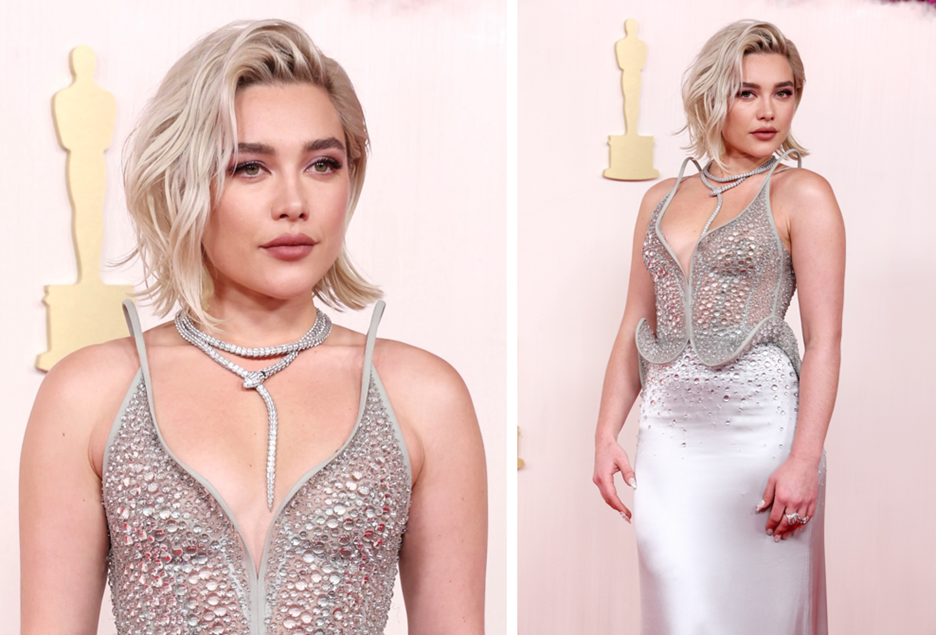 Người bạn diễn của Zendaya, diễn viên Florence Pugh cũng lựa chọn BVLGARI cho set đồ dự thảm đỏ của mình. Cô nàng diện một chiếc Vòng cổ Serpenti trang sức cao cấp bằng vàng trắng đính 2 viên kim cương cắt hình quả lê rực rỡ cùng nhiều chiếc nhẫn kim cương High Jewelry và bông tai đinh tán kim cương. Set trang sức này đã làm tô điểm cho vẻ ngoài rực rỡ của cô nàng.