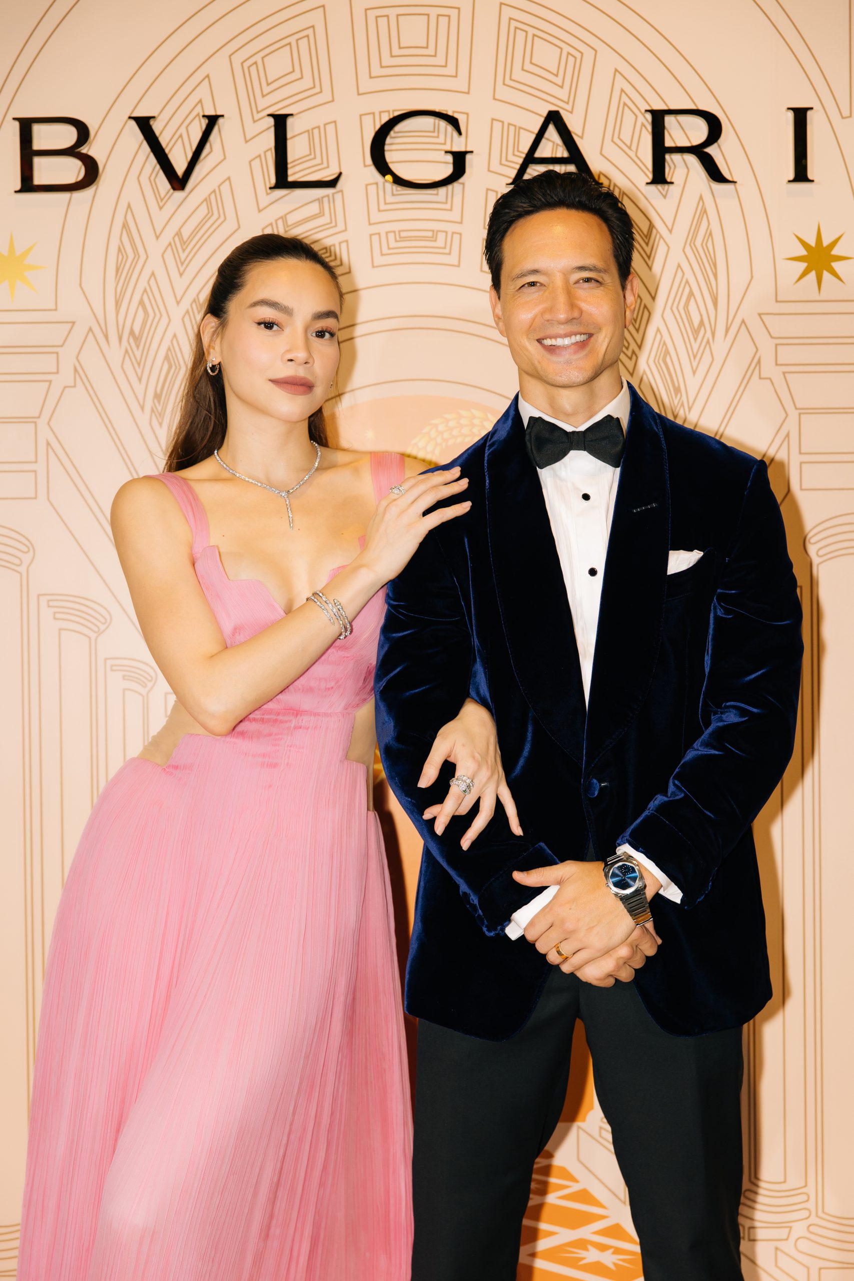 Đồng hành trên hành trình tạo ra một thế giới diệu kỳ với BST trang sức của BVLGARI, vợ chồng Hồ Ngọc Hà – Kim Lý nổi bật trong vòng cổ Serpenti Viper vàng trắng nạm kim cương (8,21 carat) cùng bông tai và nhẫn đồng điệu, vòng tay Serpenti vàng trắng và bạch kim nạm kim cương (5,42 carat), điểm thêm 1 nhẫn Serpenti Tubolari vàng trắng nạm kim cương (3,58 carat) và ngọc lục bảo (0,26 carat) cùng đồng hồ Octo Finissimo lịch lãm.