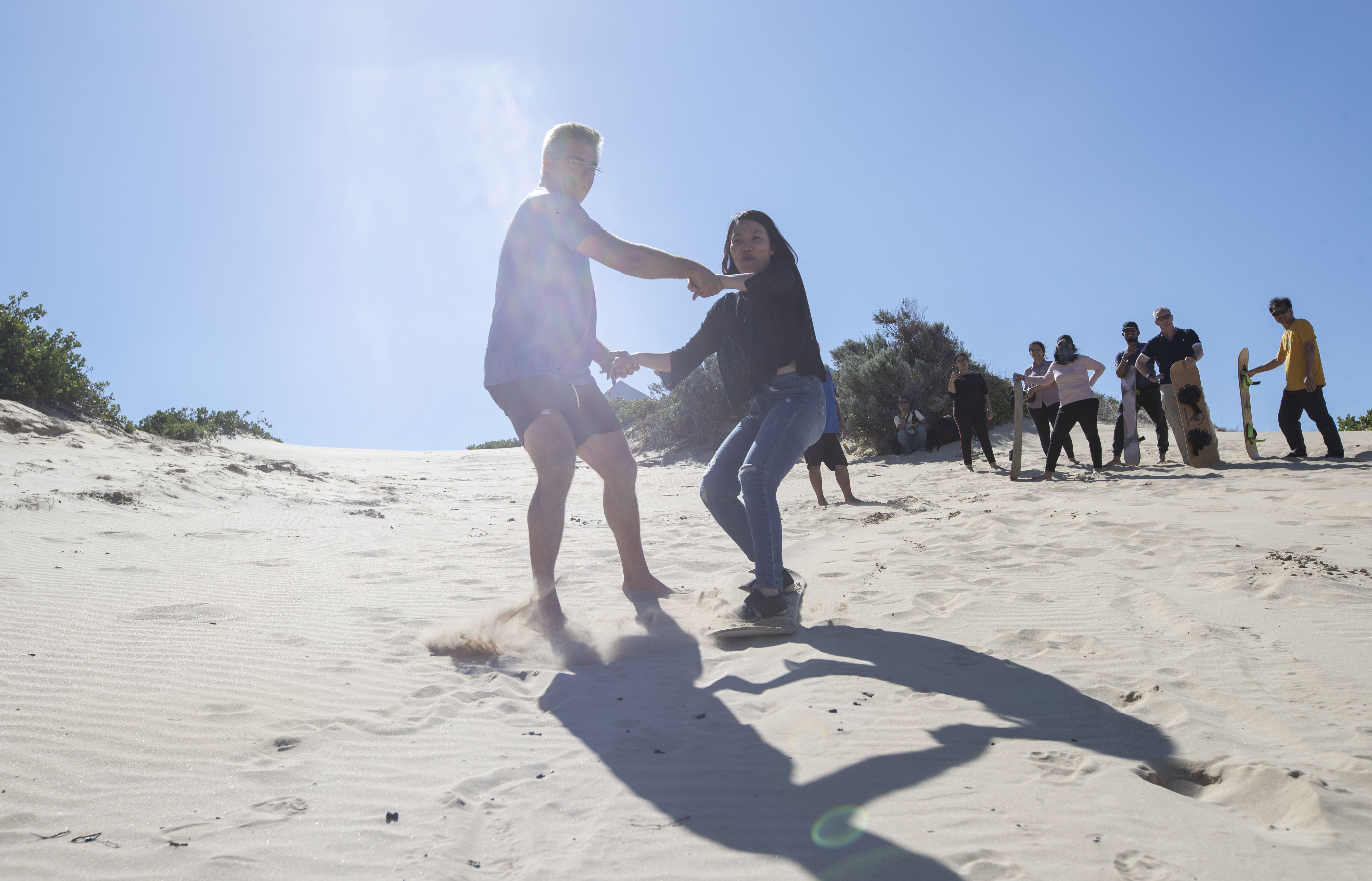 Bắt đầu vào Eastern Cape, chúng tôi dừng chân tại ngay vịnh Jeffreys để nghỉ ngơi lấy sức sau một hành trình dài. Thành phố ven biển tấp nập khách du lịch dừng chân và đặc biệt là những người mê thể thao. Thời điểm cuối hè, nước biển Ấn Độ dương khá lạnh nhưng vẫn không cản được những tay lướt sóng trổ tài. Không ai trong số chúng tôi biết lướt sóng nên chúng tôi chọn trò lướt cát. Những bãi cát ở đây khá lớn, mấp mô và hoang sơ, có những nơi lại dốc thẳng đứng. Mỗi lần chơi khoảng 15 – 20 phút và có khoảng 2 hướng dẫn viên cho 10 người chơi. Jeffreys trong mắt tôi mang màu vàng, màu của những đụn cát nằm bên bờ biển Ấn Độ Dương.