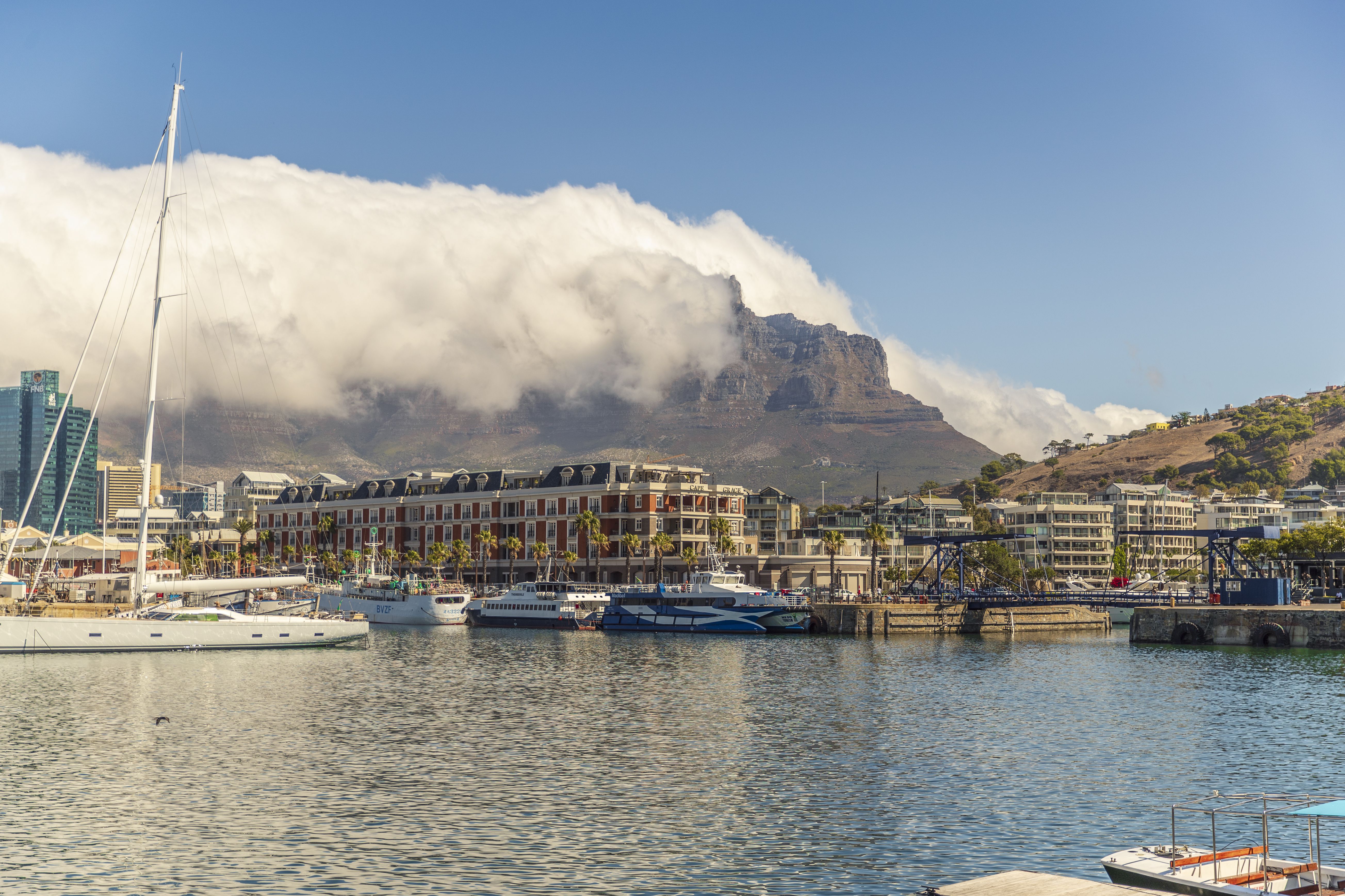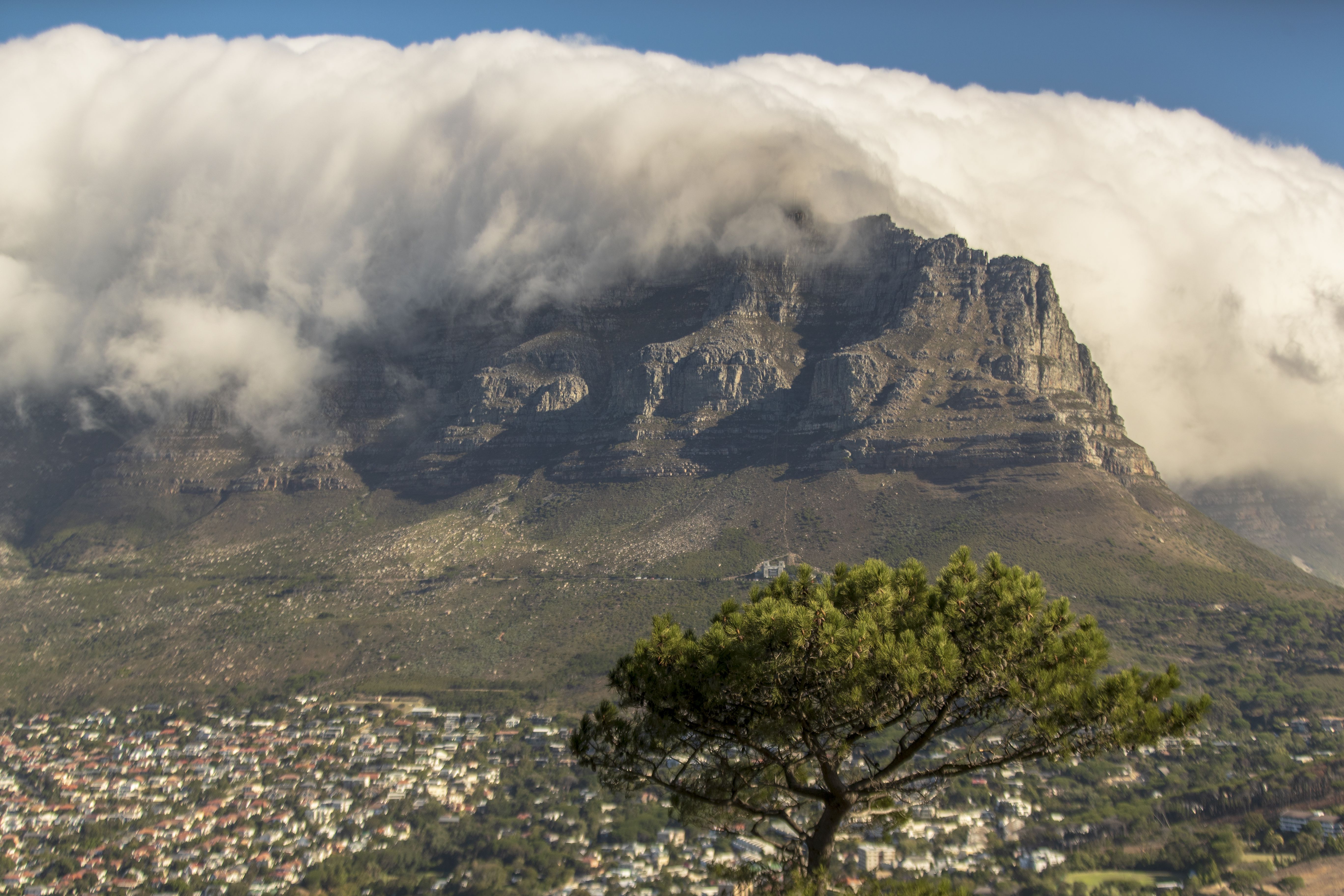 Thành phố cổ kính nhất của Nam Phi nằm ở bờ biển tây nam mang khí hậu Địa Trung Hải nên không khí khá dễ chịu. Xe chạy khoảng 1 tiếng rưỡi từ khách sạn đến điểm tham quan hút khách của Cape Town là vườn quốc gia Table Mountain (Núi Bàn), từ đây bạn có thể đi cáp treo lên Table Mountain, một trong 7 kỳ quan thiên nhiên của thế giới hiện đại, và ngắm nhìn Cape Town từ trên cao. Ngay điểm khởi đầu của vườn quốc gia đã tập trung nhiều nhóm bạn và gia đình đến thư giãn cuối tuần, tại đây có thể thấy ngàn lớp mây trắng kỳ ảo ôm lấy những ngọn núi trập trùng. Nếu được gọi tên một màu sắc cho Cape Town, màu trắng sẽ là gam màu đầu tiên tôi nhớ đến.