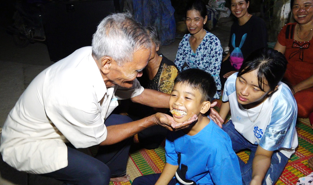 Sau nghi thức cúng trăng là nghi thức đút cốm dẹp. Người lớn tuổi trong nhà sẽ gọi lần lượt từng người con cháu ra sân. Mỗi đứa trẻ sẽ được người lớn đút cốm dẹp, chuối và khoai luộc. Việc đút thức ăn đầy miệng thể hiện cho sự dư dả, sung túc. Không chỉ vậy, người trẻ còn được hỏi về ước muốn mai sau và được người lớn vỗ nhẹ vào lưng cùng lời chúc phúc cho ước nguyện thành sự thật.