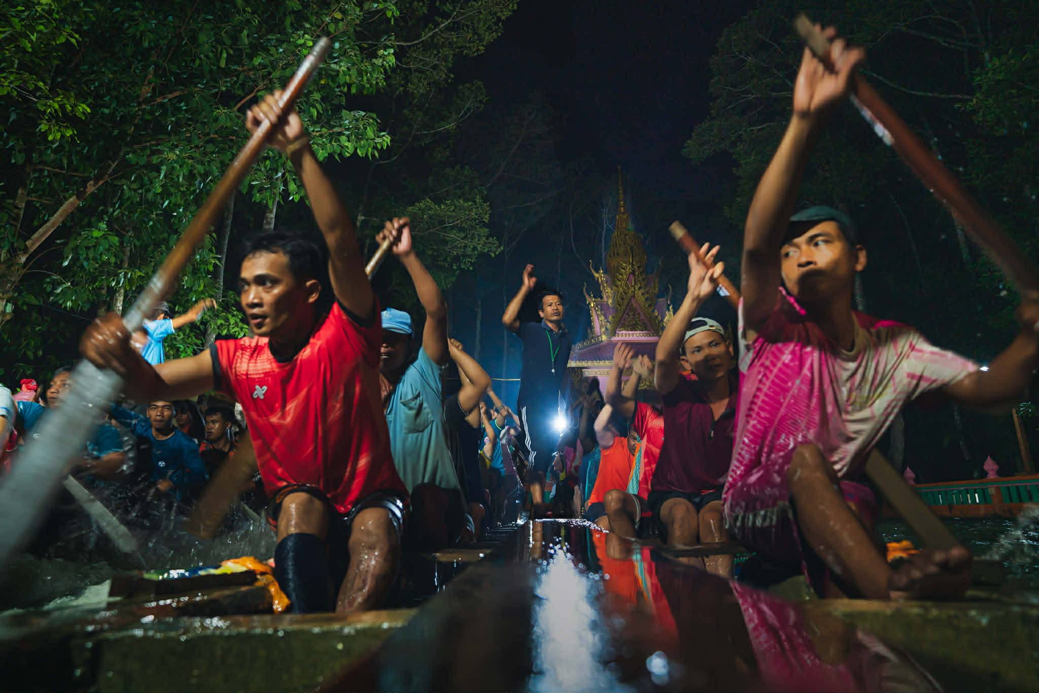 Sau khi hoàn thành phần tập ở sân, đội thi đấu sẽ đi vòng ra phía sau chùa, nơi có con mương nhỏ với hai chiếc thuyền giống như bộ xương cá khổng lồ. Tại đây, họ sẽ chèo với mái dầm thật, cảm nhận sức nặng và sức chảy của dòng nước. Mỗi nhịp dầm khua dứt khoát, mạnh mẽ đánh xuống mặt sông, bọt nước tung trắng xóa hòa cùng mồ hôi của người luyện tập.