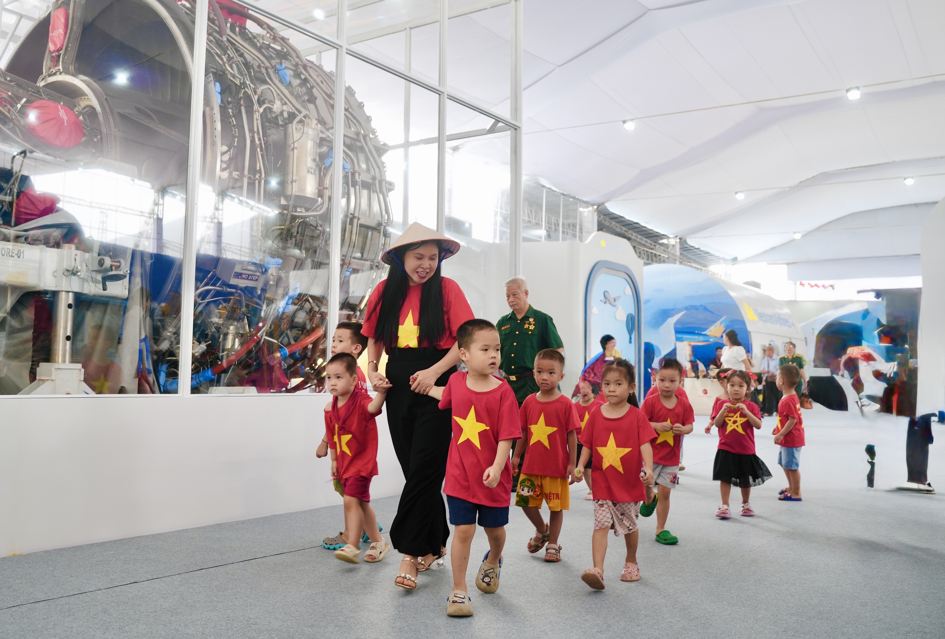 Các khách tham quan “nhí” hào hứng khi lần đầu được trải nghiệm không gian trưng bày giới thiệu hành trình phát triển Hãng hàng không quốc gia Việt Nam, gắn liền với những dấu mốc vẻ vang của dân tộc.