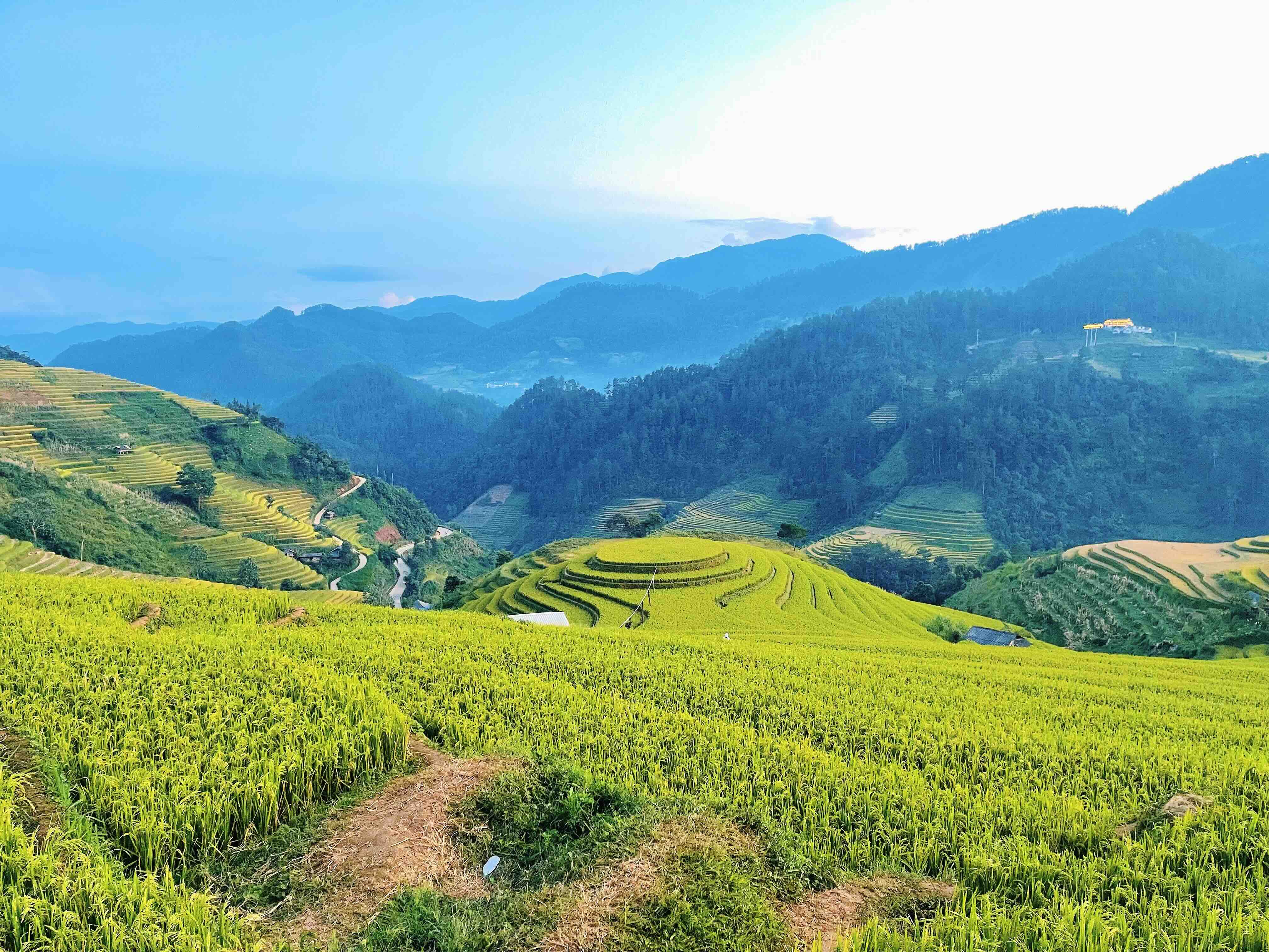 Nắng đầu thu rót xuống những triền núi Tây Bắc, đánh thức cả thung lũng Mù Cang Chải trong sắc vàng óng ả. Từ phía trên cao nhìn xuống, những thửa ruộng bậc thang xếp tầng nối tầng như những nếp váy khổng lồ của núi rừng, mềm mại và kiêu hãnh. Gió mang theo mùi thơm dịu của lúa chín, khiến bước chân tôi trên mảnh đất này cũng trở nên thong dong, như đang đi giữa một bản nhạc mùa vàng.