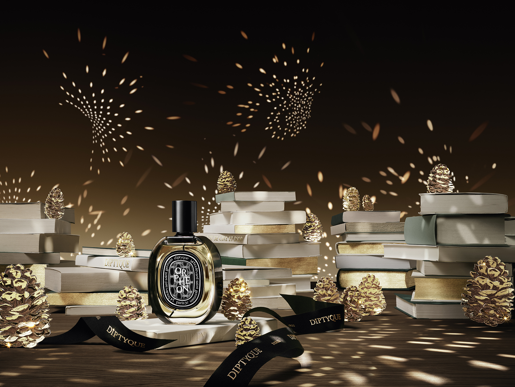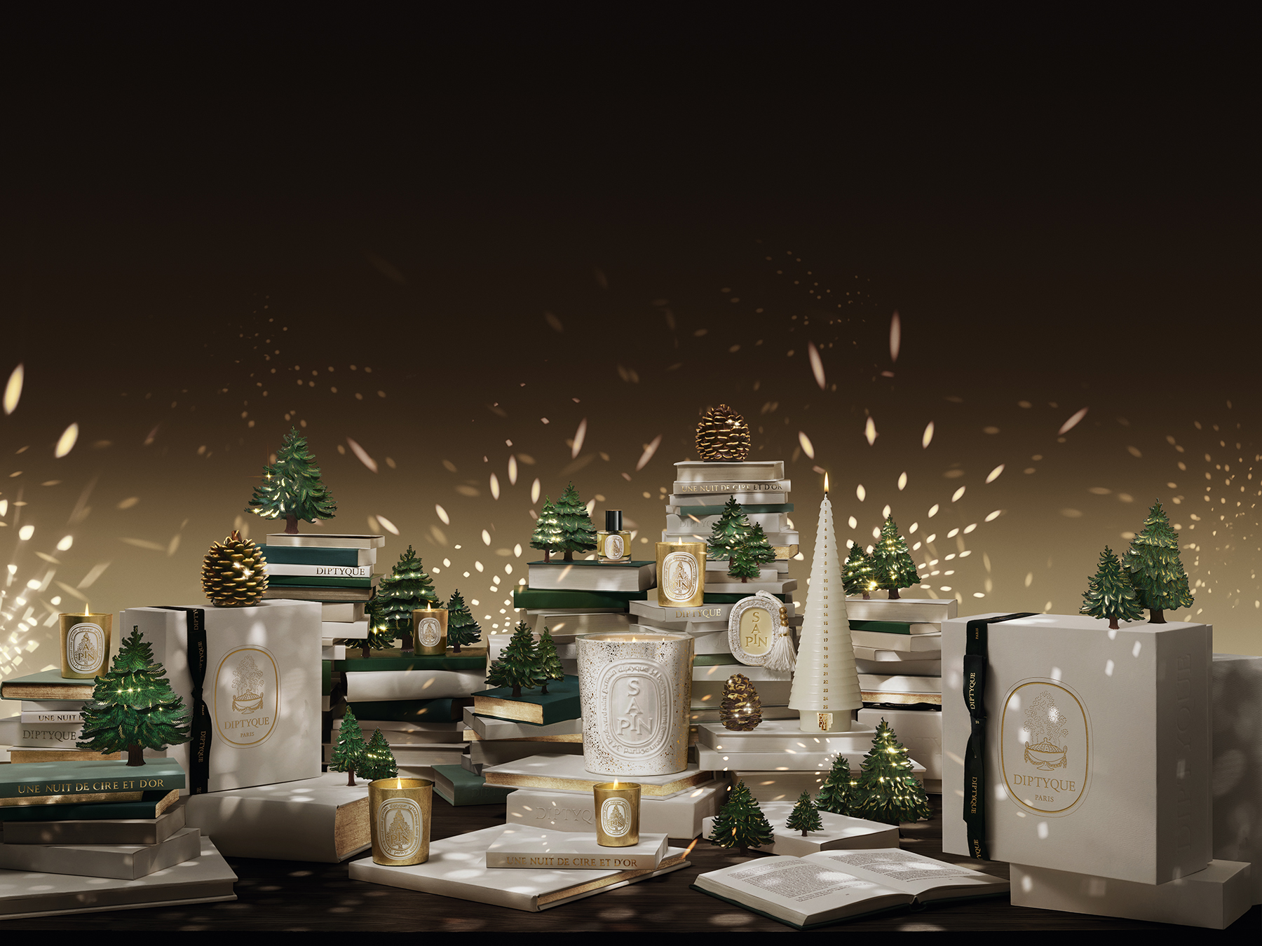 Lấy bối cảnh Saint-Germain-des-Prés – nơi khởi nguồn của thương hiệu, BST tái hiện không gian nhiệm màu nơi mọi vật hóa thành ánh sáng và sắc vàng rực rỡ khi đồng hồ điểm nửa đêm. Điểm nhấn của BST lần này là hương Sapin (cây thông), vốn là mùi hương quen thuộc của Diptyque, gợi nhớ mùi hương tươi mát của rừng thông Siberia hòa cùng tinh dầu linh sam và tuyết tùng ấm áp. Hương thơm tinh tế được sử dụng trong nhiều sản phẩm khác nhau, từ nến Sapin dát vàng thủ công, nến lịch mùa vọng đến hình Oval tỏa hương, bộ khuếch tán thủy tinh Murano hay phiên bản nến cỡ lớn trong ly tráng men ánh vàng, giúp lan tỏa không khí lễ hội.