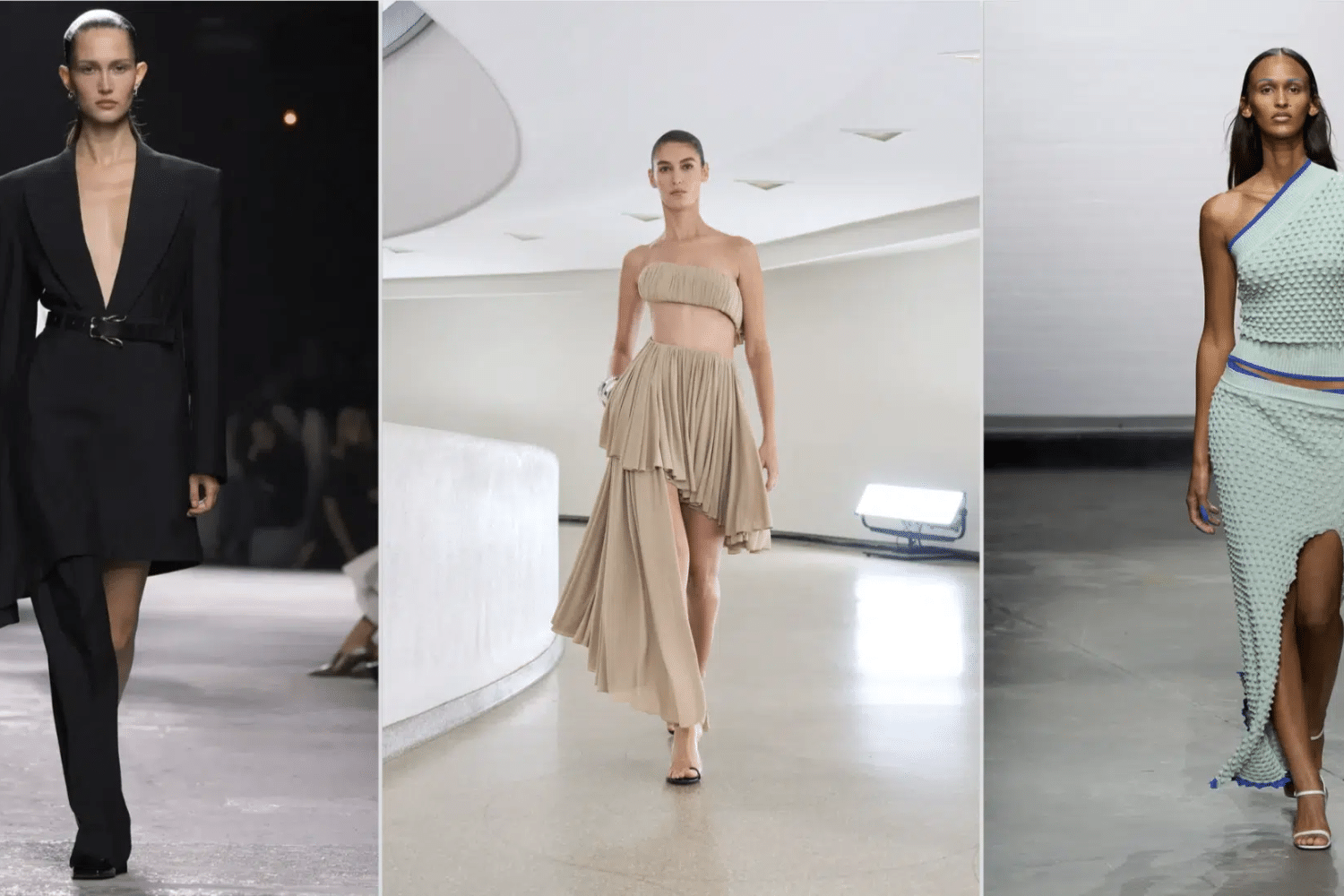 Đầm cúp ngực đánh dấu bước quay trở lại ấn tượng trên sàn diễn Xuân Hè 2025. Các thiết kế đầm cúp ngực nổi bật với sự kết hợp của nét quyến rũ tối giản cùng hoạ tiết mới đầy táo bạo. Các nhà mốt như Acne Studio đã bắt kịp xu hướng này khi giới thiệu một thiết kế đầm cúp ngực vô cùng độc đáo với đường viền cổ trái tim. Trong khi đó, MM6 Maison Margiela đã phá cách với các chi tiết xếp nếp tạo nên nét cá tính cho kiểu dáng hở vai thêm phần thu hút. Tại LaQuan Smith, các thiết kế hở vai họa tiết da rắn mang đến sức quyến rũ gợi cảm, làm nổi bật sức hấp dẫn đa dạng của xu hướng này.
