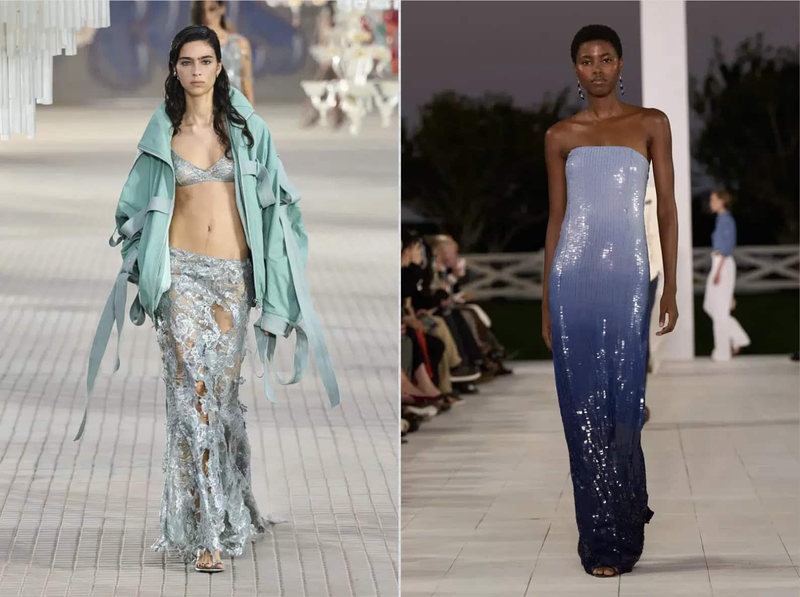 Nguồn cảm hứng bất tận từ nước sẽ được tận dụng tối đa vào thời trang Xuân Hè 2025. Từ những viên gạch sống động tại hồ bơi, màu xanh nhiệt đới gợi lên độ sâu thẳm của đại dương hay vảy đuôi và vỏ của các loài động vật dưới nước đều được xuất hiện trên những bộ quần áo, váy vóc theo cách đặc biệt nhất. Xu hướng năm 2025 sẽ tập trung vào sự xa hoa, sành điệu cho những bộ trang phục nổi bật với sắc thái xanh lam, màu kim loại cùng các loại vải bóng. Đối với mùa hè năm 2025, màu ngọc lam được dự báo sẽ tăng 8% so với mùa hè trước, trong khi các yếu tố lấy cảm hứng từ nàng tiên cá như sequin và váy maxi đuôi cá dự kiến ​​sẽ tăng lần lượt 20% và 17%.