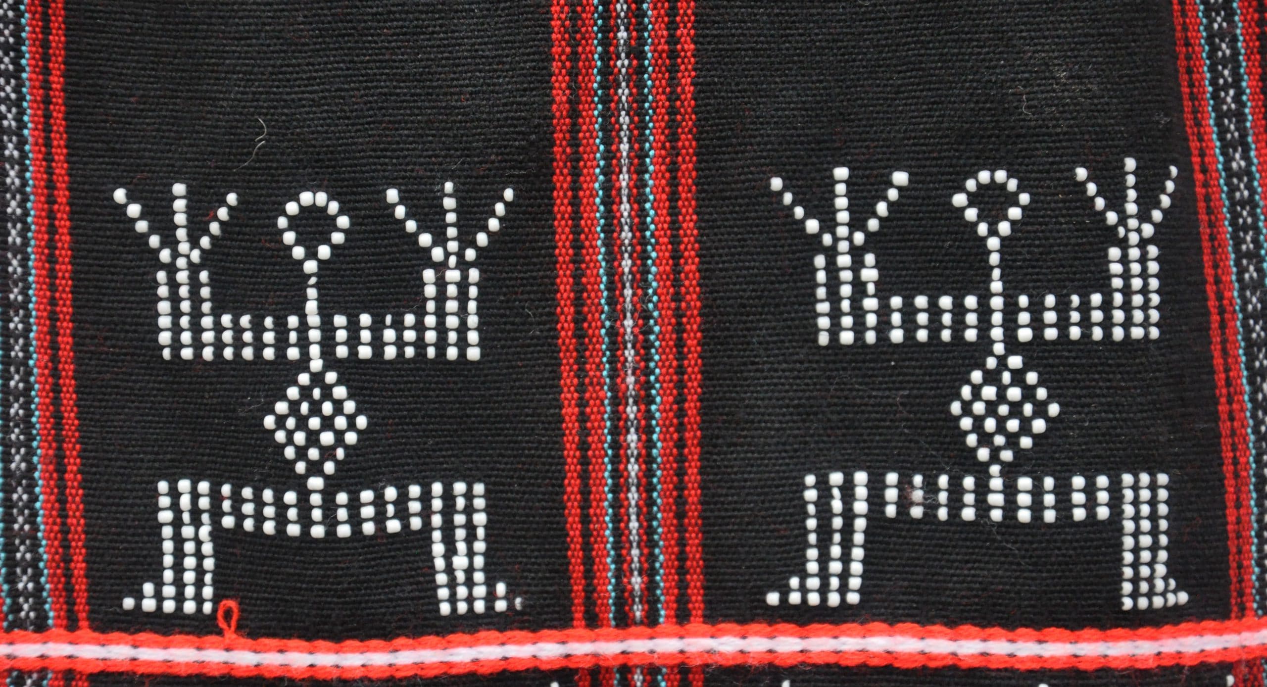This dance is portrayed vividly and artfully on brocades and traditional costumes by Cotu weavers. The pattern of Da da is often decorated on dresses of women and girls as well as loincloths of men and boys. Adept at the a rac (bead) weaving technique, Cotu craftspeople place white beads onto the rough surface of a black fabric, forming the Da da pattern. The motif of Da da is also often found on the tails of men’s loincloths since these are ideal flat surfaces for the mobile painting to be seen from both the front and the back when men wear them along with precious jewelry made of agate and fangs at festivals.