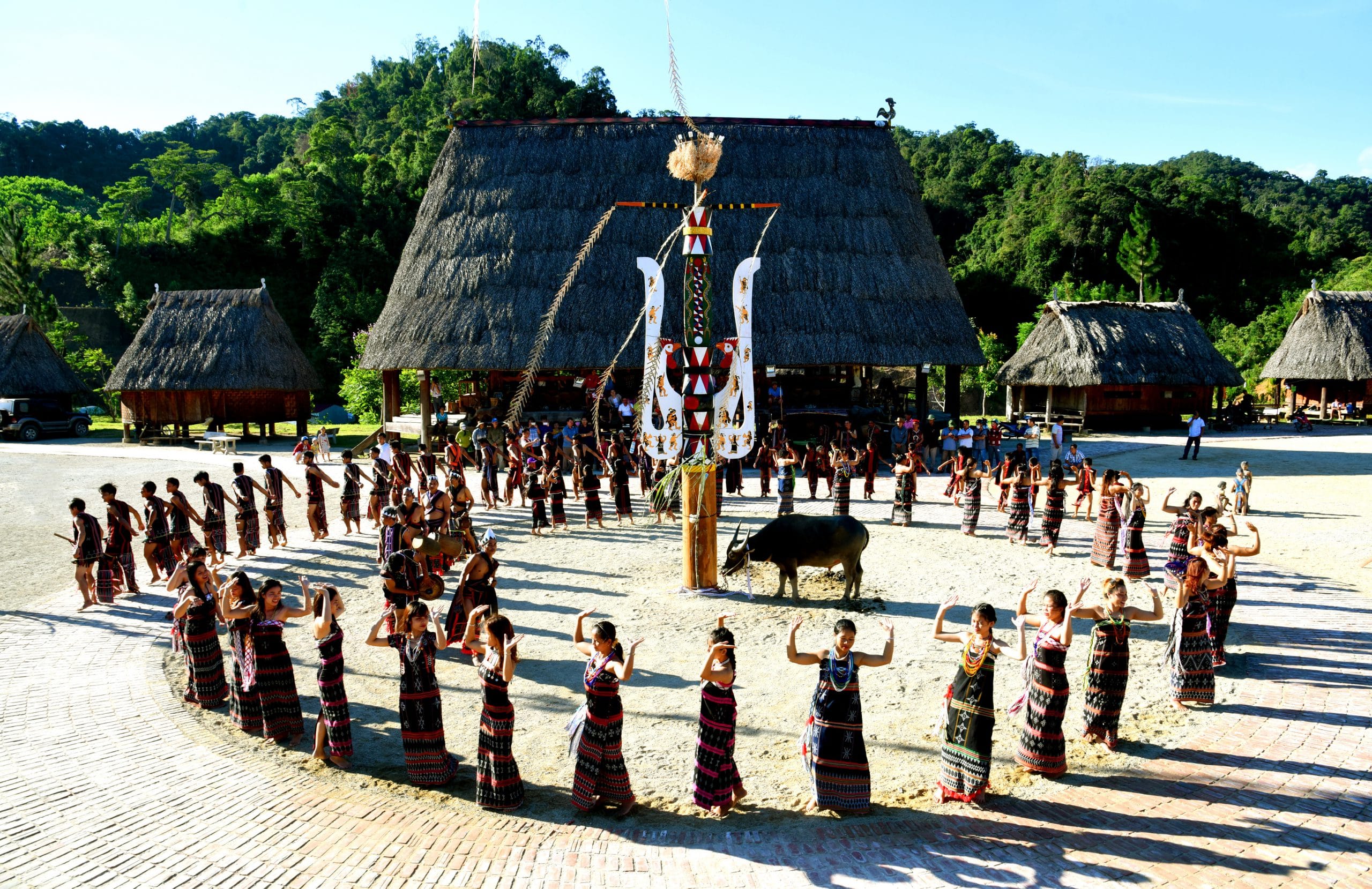 “The dance of offering to the heavens” of the Cotu is performed during community festivals. To the sounds of drums and gongs, women enter the courtyard of the village house and start dancing first, followed by men. If there are many dancers, two concentric circles are formed, women in the inner circle and men in the outer circle, representing a sense of protection. There is a harmonious combination of women’s and men’s dances. While women perform da da, men perform tan tung, creating a complete dance formation known as Tan tung da da. Everyone dances in a circle and steps counterclockwise to the vibrant beat of drums and gongs that awaken the sleeping mountain.