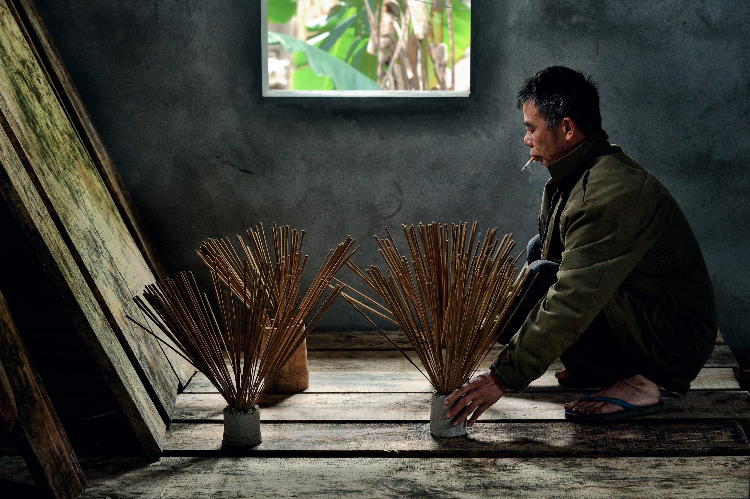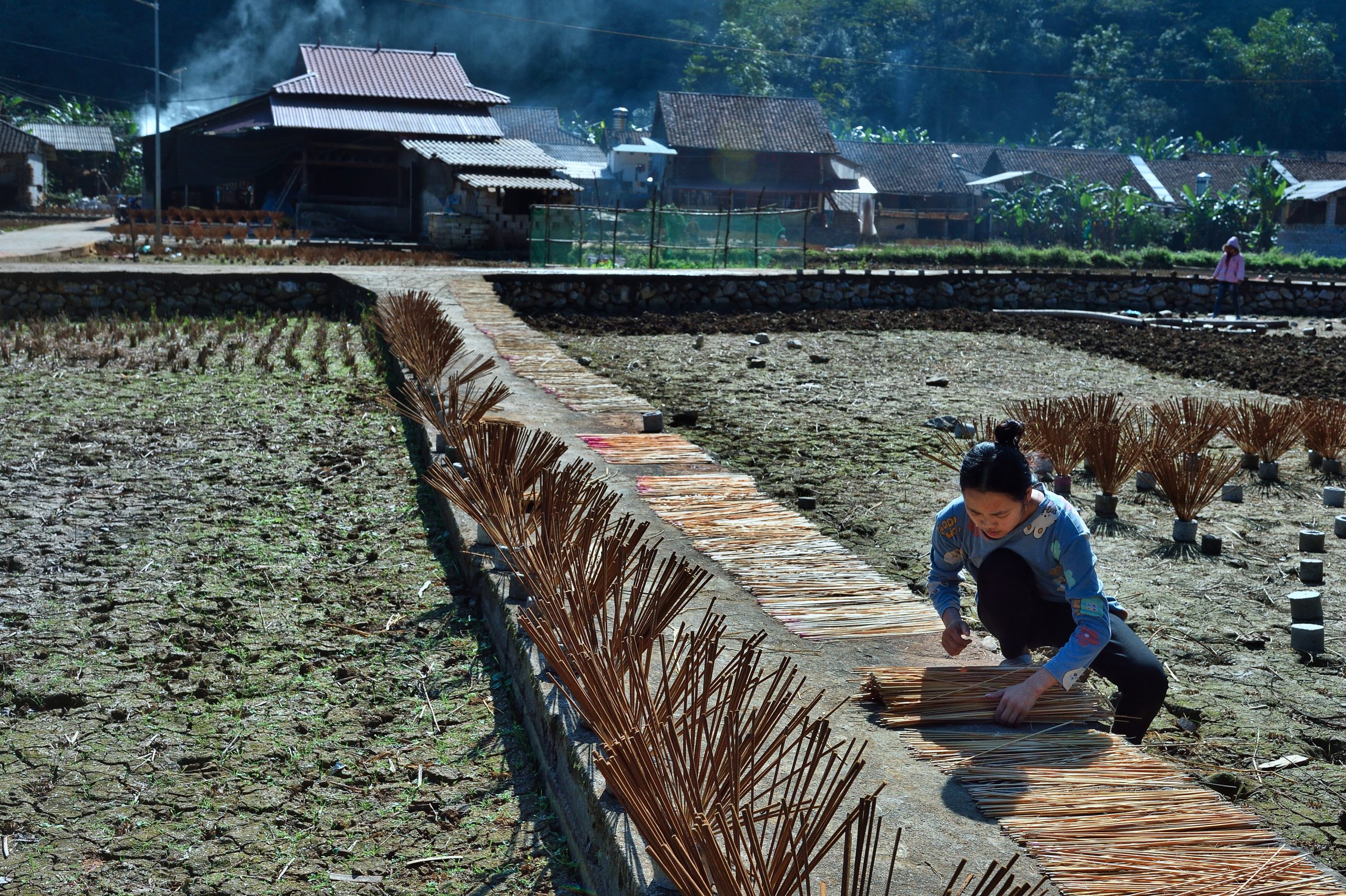 The bark and leaves are dried, crumbled, ground into a powder, and mixed with sawdust and the binding agent. The sticks are dipped up to four times in this mixture, with the bases dyed red. They are dried to produce the final product. Drying the incense depends heavily on the weather, so the villagers always hope for sunny and dry days, on which it takes only one day to dry a batch. If the weather is overcast, it can take three or four days to thoroughly dry the incense.