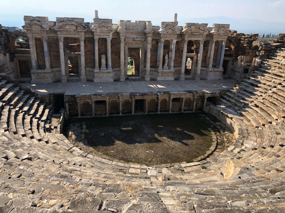 Hierapolis – meaning “holy city” – was built as a thermal spa town by the Greek Attalid dynasty in the 2nd century BCE and was eventually absorbed by Rome. Despite being destroyed by an earthquake in 60 AD, Hierapolis retains the grandeur of the land where it once flourished, with the ruins of imposing city gates, temples, statues of sacred gods and a magnificent outdoor theater. The highlight of the historic site is the Roman theater, which remains intact today and is reached by a lovely meandering trail on a gentle hill flanked by yellow shrubs. On arriving, I was awed by the striking marble construction, able to host around 10,000 spectators with 50 rows of seats among nine sections. It stands as a testament to the amazing artistry and skill of its ancient founders.