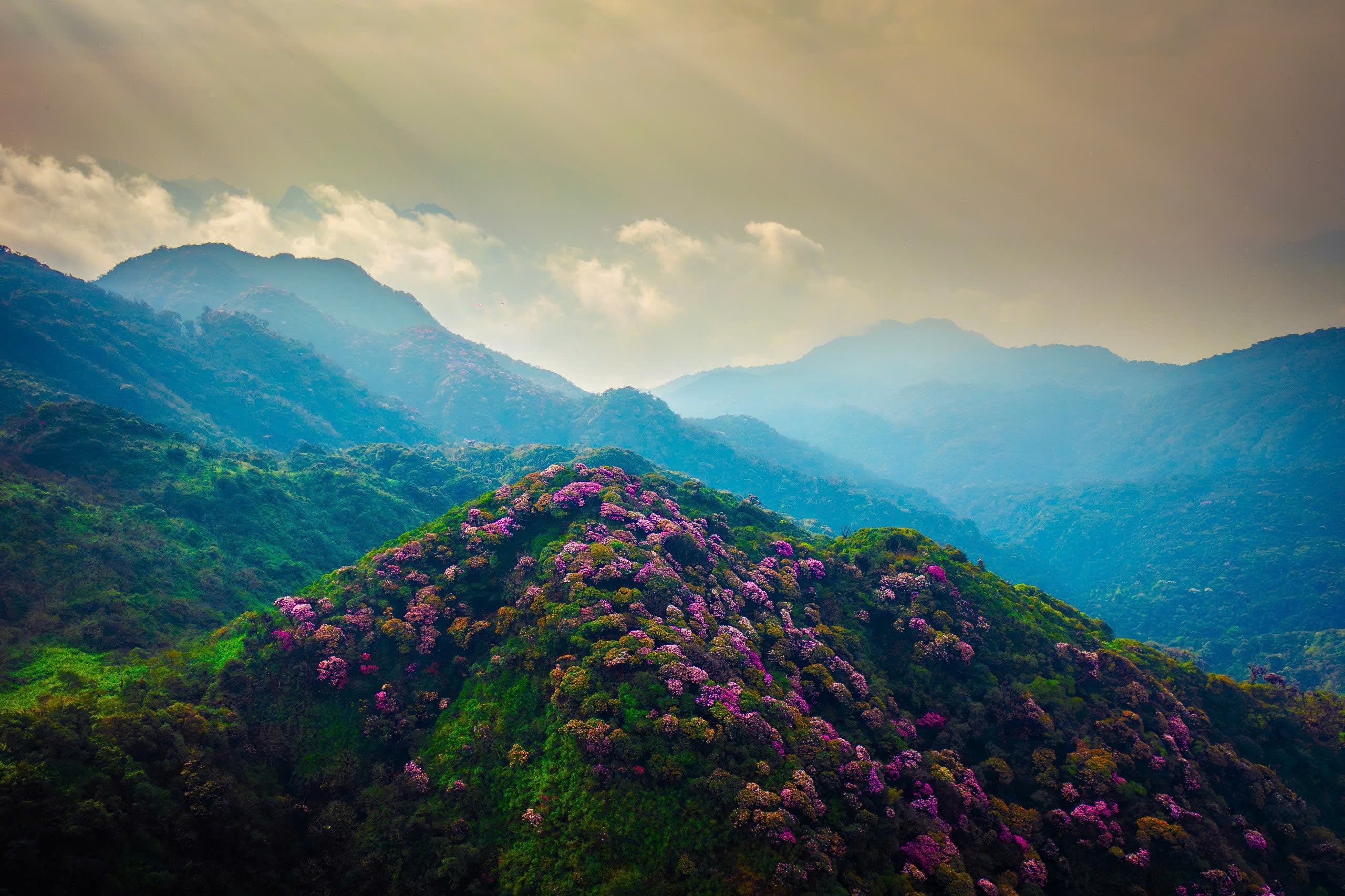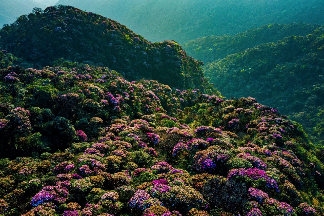 Lunch finished, I resumed the trek under the blazing sun, pushing slowly through the cardamom forest and fallen blossoms that carpeted the ground. From an open ridge, I gazed across a valley awash with crimson and violet flowers glowing against the dark green mountainside. The cool breeze rising from the depths below brought with it a surge of energy that carried me onward. By 3 p.m., I reached the Si Thau Chai Camp, exhausted from the unrelenting climb. From here, the most beautiful rhododendron forest lay only a short 15-minute walk ahead. When I finally emerged into the open, the sunset bathed the landscape in golden light. The rhododendrons – mostly bright pinks and fiery reds – were strikingly vibrant, their thick petals clustered in magnificent bursts of color. Under the soft glow of dusk, the forest seemed to glow with pride, a living masterpiece painted by nature.