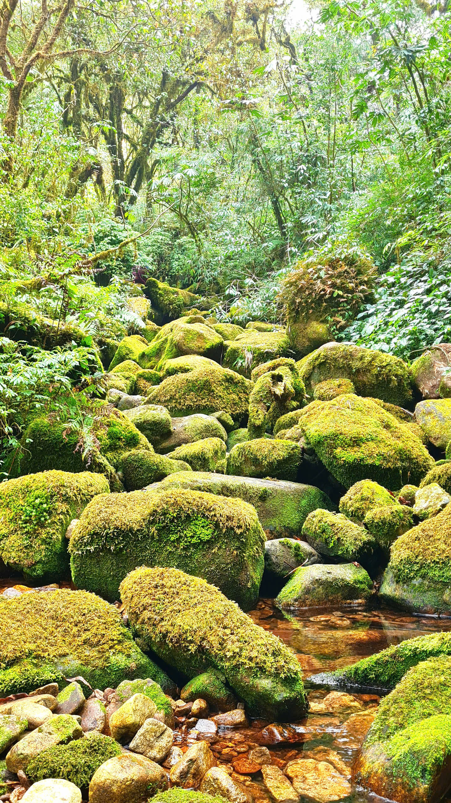 Afterward, I descended toward the Ta Leng trail, once again passing beneath the radiant rhododendrons. I strolled under the vaulted forest canopy, stepping gently over moss and fallen leaves, surrounded by blossoms that glowed overhead – a literal heaven of flowers that felt almost surreal. Unlike the flower-filled western slope, the Ta Leng side is covered in dense, damp forest and crisscrossed by streams. Along the way, ancient tea trees and mossy groves appeared like scenes from a dream, shrouded in the quiet mystery of the mountain. The vegetation is lush. This side of the mountain is home to many species, including a unique mountain frog whose tadpoles grow to remarkable size.
