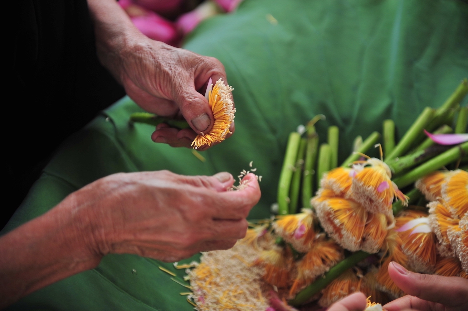 If the small pond by Kim Lien Pagoda hints at a meditative atmosphere, inviting the human mind to tranquility, then Dam Tri, specifically used for lotus cultivation, suggests the elegant pleasure of enjoying lotus tea. In the summer, the lotus pond is always bustling with visitors who come here to take pictures. Tea connoisseurs and wine enthusiasts often gather here, leisurely observing the tea-makers delicately plucking flowers amidst hundreds of lotus blooms still adorned with the night’s dew. The narrow road that cuts through the pond is an ideal spot to bike in the cool breeze, offering splendid views of kayakers, rowers, and stand-up paddleboarders on the lake.
