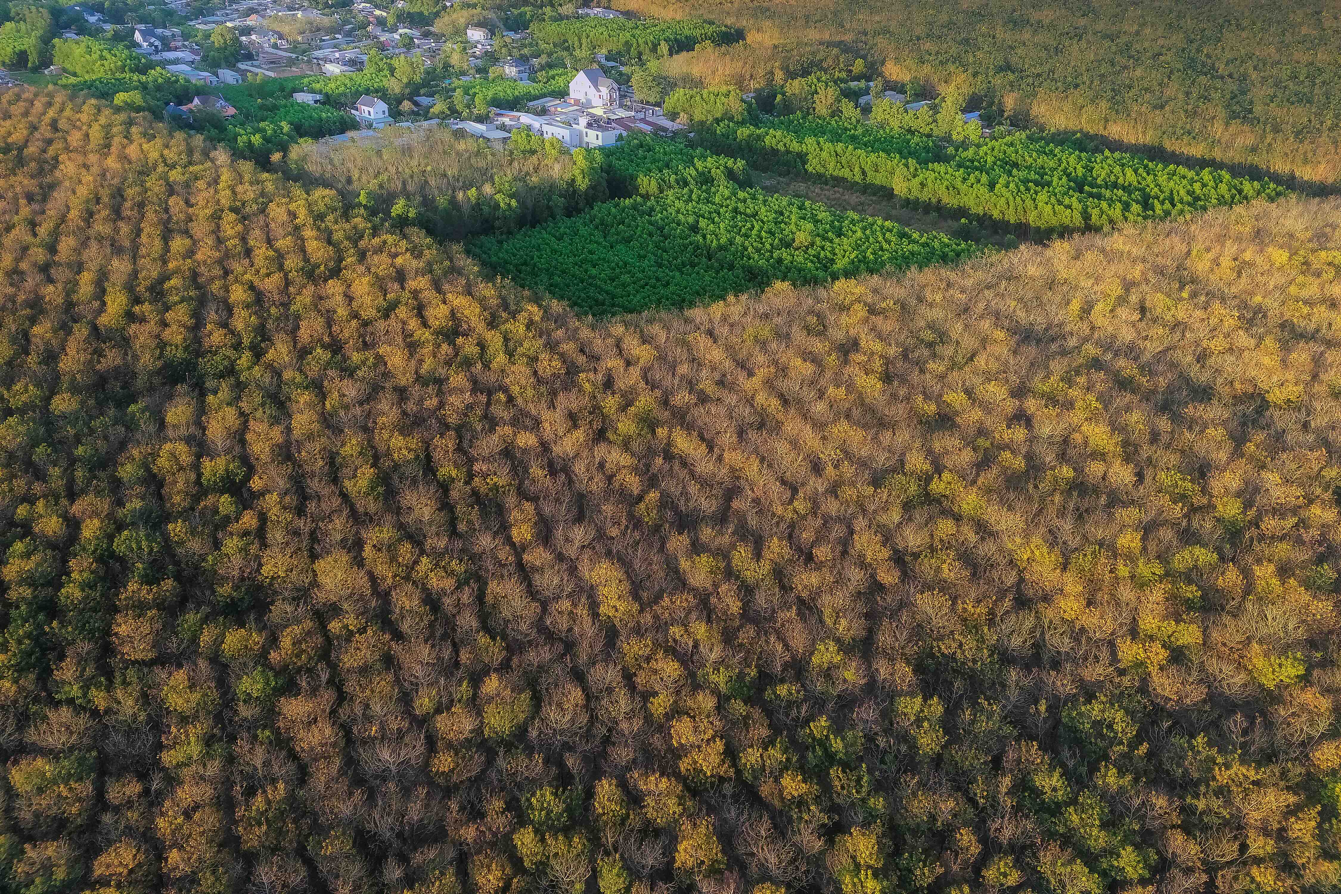 From above, the rubber plantations resemble a vast mosaic with patches of yellow, red, brown, and green blending with the light. Straight rows of trees stretch toward the horizon, creating a natural tempo that is mesmerizing in its stillness – calm, unhurried, and profoundly harmonious.