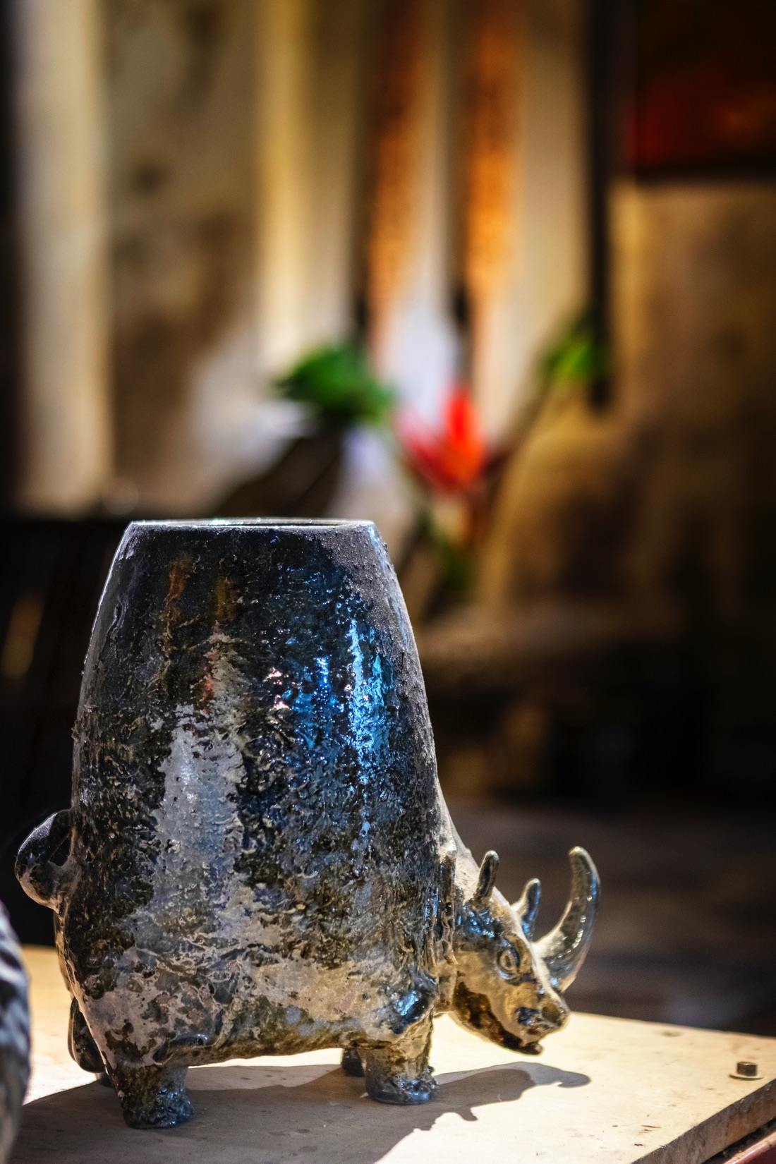 The first is Nguyen Ngoc Hung, known as “Hookah Hung” among fellow artisans. This moniker comes from his craft, which Mr. Hung began to practice 30 years ago. Mr. Hung coats film-thin layers of copper around the mouths of ceramic hookahs and bamboo pipes, elevating the value of simple items that were once prized by families. He has expanded his offerings by lining and covering pots, cups, lamps, and trays with copper, as well as decorating various objects with bright and cheery yellow lines, patterns, and textures. His talents draw upon the traditions of his hometown, the copper village of Dai Bai in Bac Ninh province. After meeting goldsmiths from Dong Xam Village in Thai Binh province, Mr. Hung has been improving his techniques ever since. Copper is an inherently hard metal that is difficult to adhere to a curved surface. However, artisans tightly press the metal into the ceramic core, increasing the rigidity of the product and enhancing its beauty. Even the most delicate Qing Dynasty bone china teacups can be copper-lined to render them shatterproof. The family works and lives in a stilt house in the gardens of Bo De. Visitors will come across a variety of unusual items, ranging from European-style chandeliers to innovative copper trays, oil lamps, and animal statues, most of which have patterns that do not conform to ancient stereotypes.