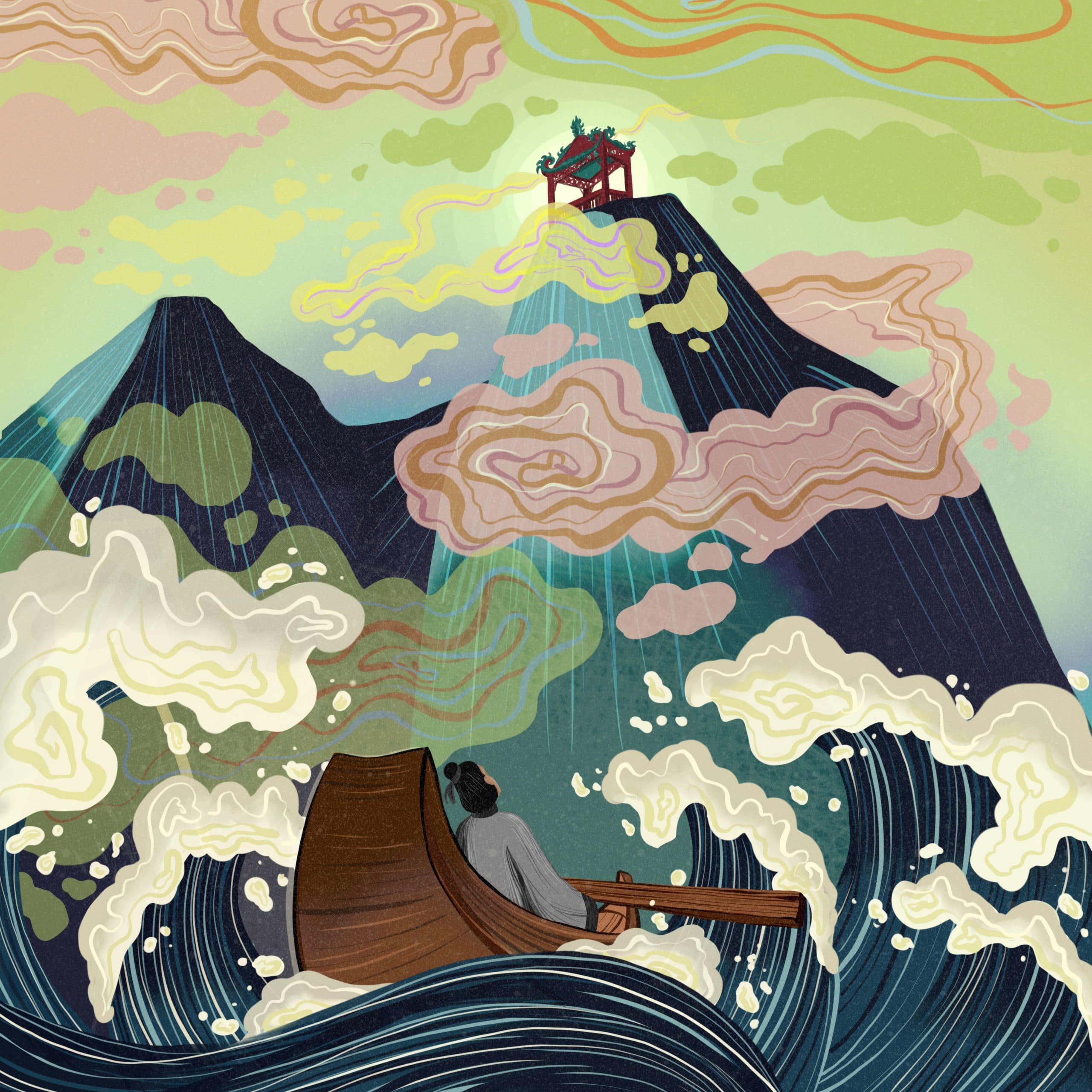 One morning at dawn, Tu Thuc climbed the highest mountain to the Holy Patron’s Gate. Suddenly, before his eyes lay an island resembling a lotus on the sea. Amazed, he set sail and reached the island. He found a vast cave and ventured inside, but as soon as he had entered, the cave’s mouth closed behind him. Tu Thuc felt his way onwards in the darkness. Seeing light up ahead, he spied high mountains with steep cliffs. After climbing to the top, he saw a magical palace.