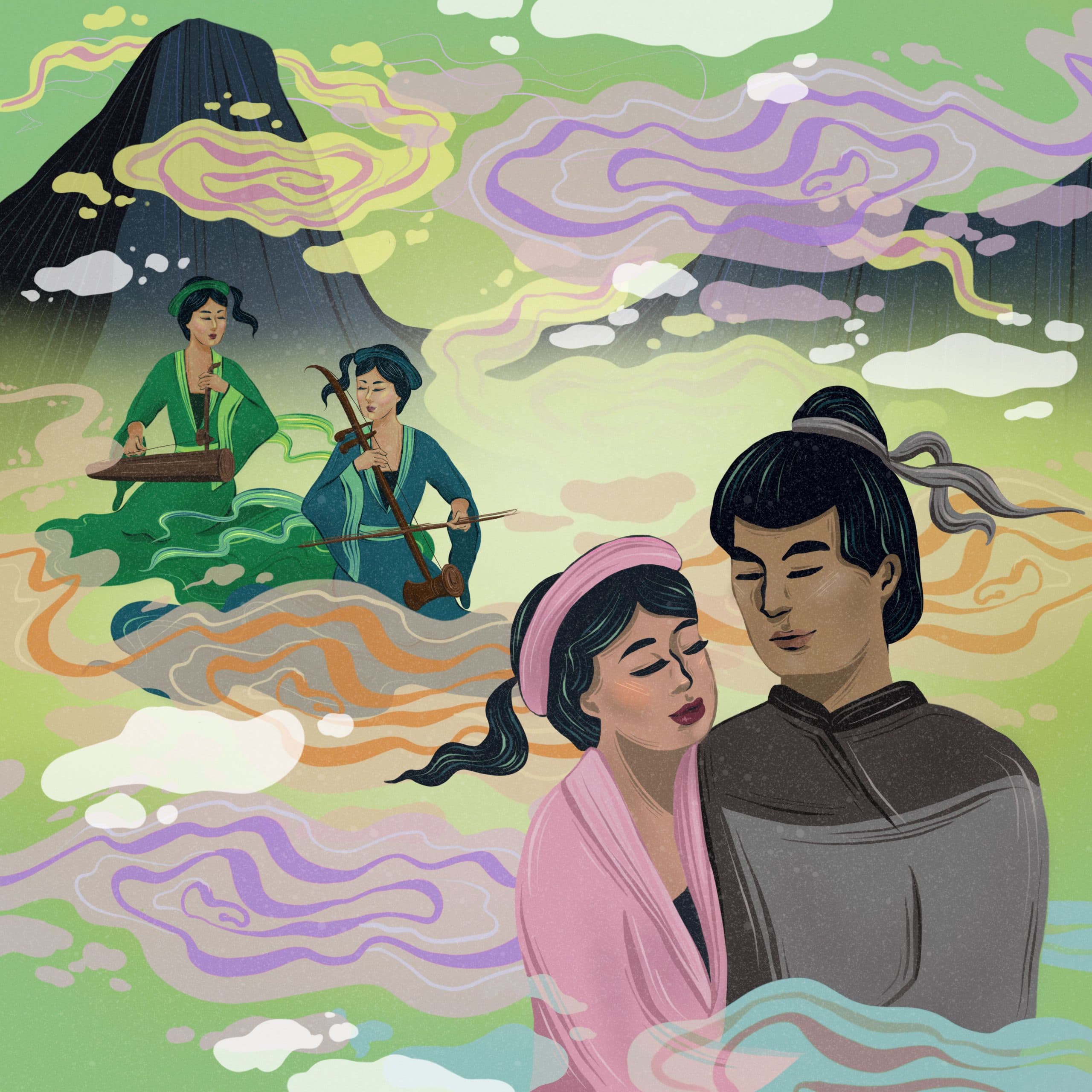 Three years flew by. Tu Thuc had everything he needed. Life was easy in the fairy realm. He remained enthralled with his beautiful wife. But as time advanced, Tu Thuc found himself missing things. One day he confided to Giang Huong: “I have been away from my parents for too long. May I pay them a visit?” Seeing her hesitate, he added: “I will just drop in for a short while, then return and stay with you forever.”