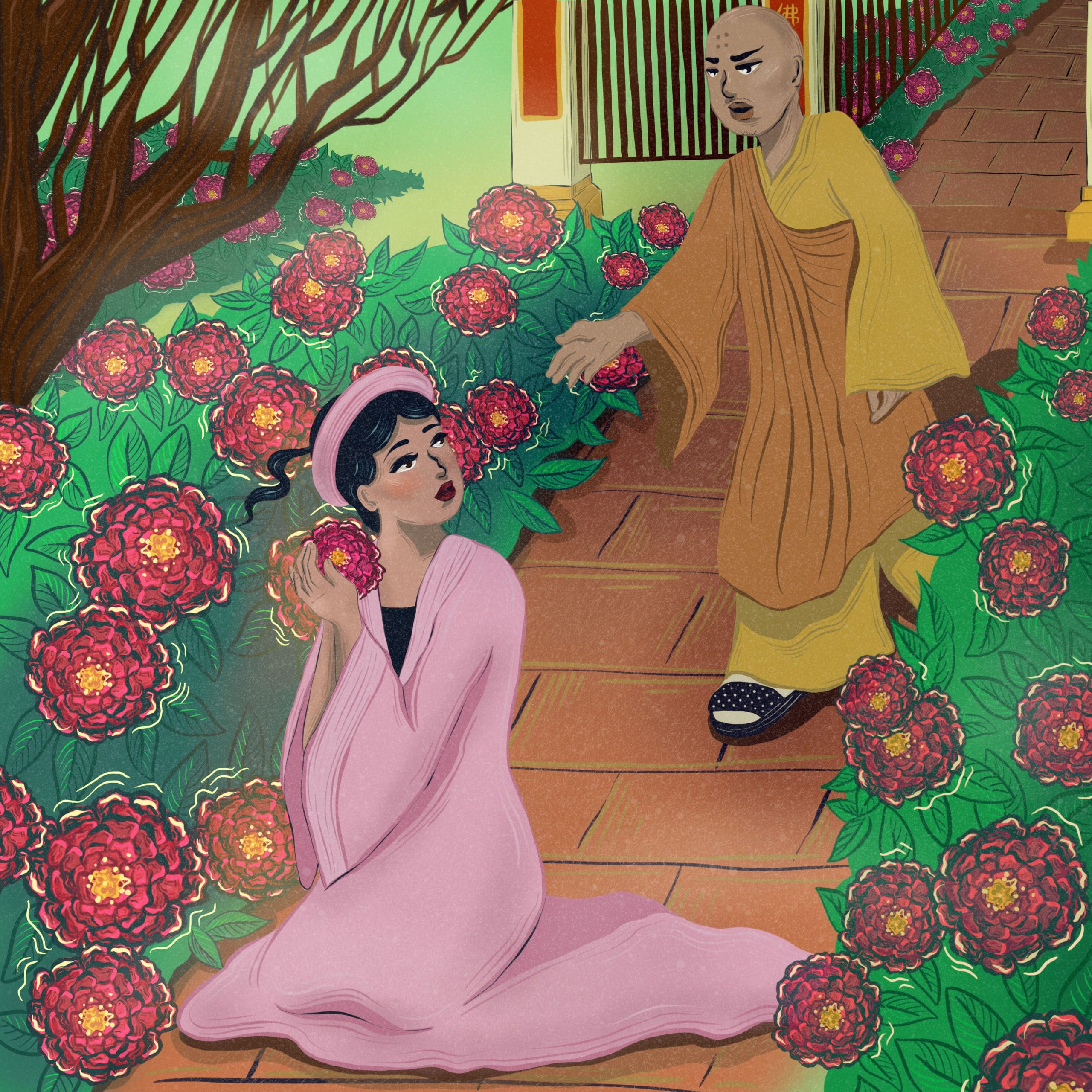 Near the district Tu Thuc governed lay a huge pagoda. Its courtyard was full of peonies. Every January, Buddhists came from far and wide to pay homage to the Buddha and admire the flowers. Tu Thuc joined the pilgrims and sightseers, traveling alone and wearing the simple disguise of a disciple. To protect the flowers, the pagoda set a rule that anyone who broke a flower must pay a fine. If they couldn’t pay, the were forced into slavery to pay off the debt.