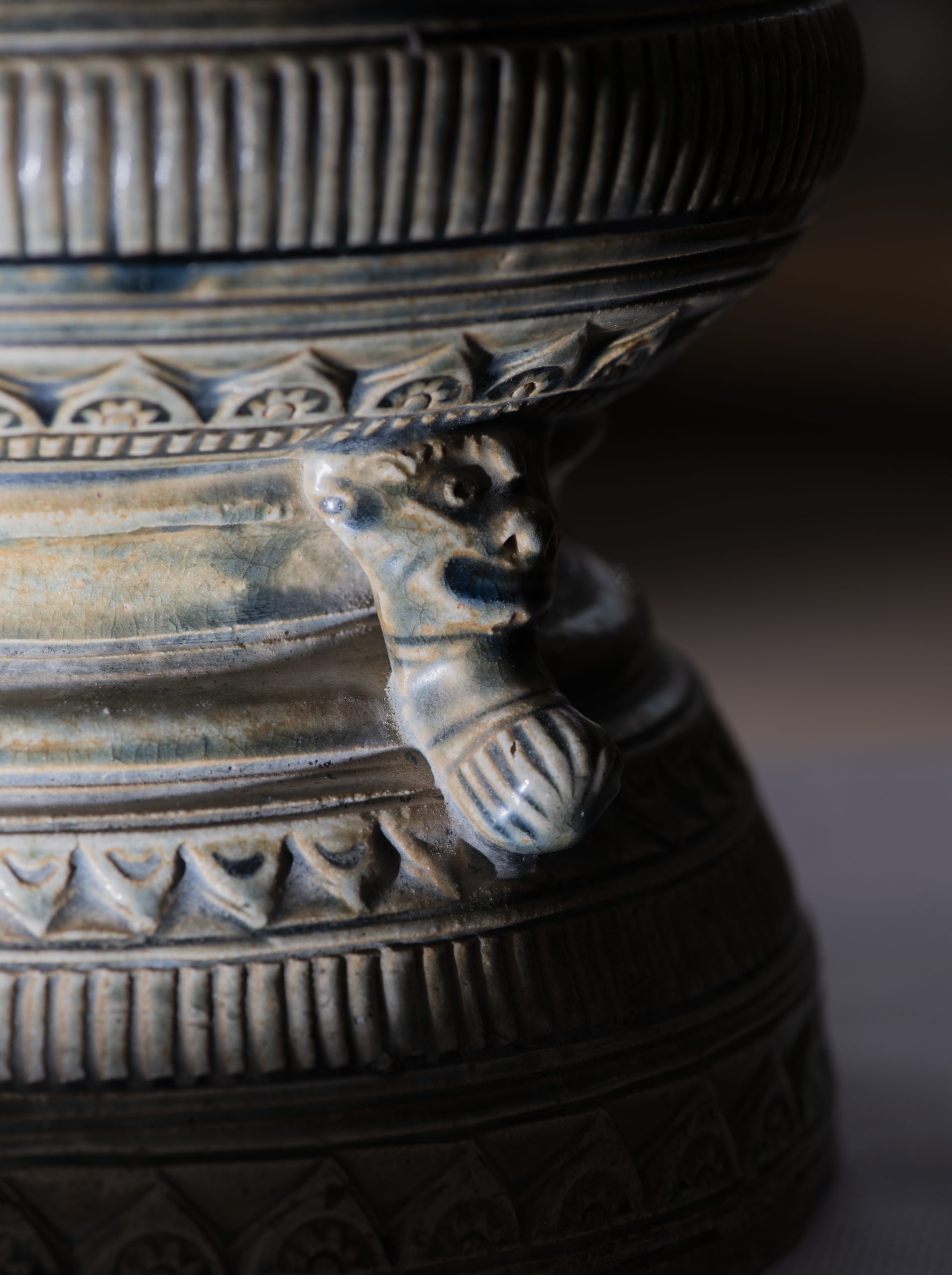 Made of grayish-blue glazed ceramic, the incense burner in the An Bien collection stands 41cm tall with a mouth diameter of 23.5cm. Its shape is cylindrical with a high, flared mouth, decorated with rectangular sections featuring carvings of coiled dragons in the “saddle-shape” motif characteristic of Mac dynasty art. These designs are enclosed within rectangular or square floral patterns on the mouth’s rim or decorated with blooming lotus motifs on the body. The incense burner is tied to our history, embodying the shape and patterns of two types of bronze drums produced by Vietnamese people.