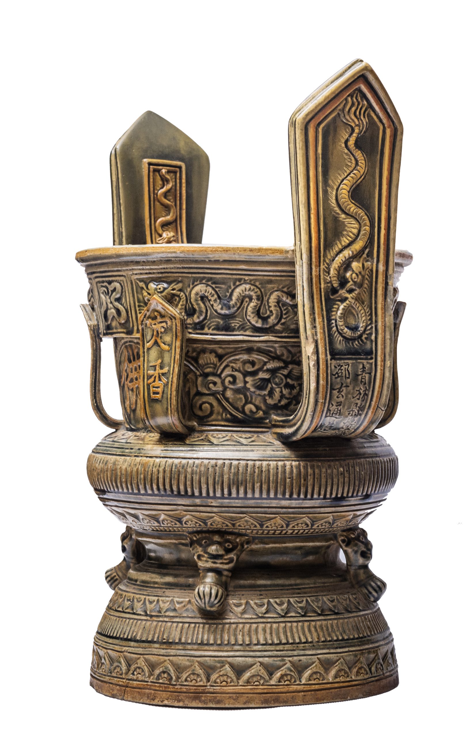 On the outer surface, there are two prominently raised and intricately coiled dragon handles. There are four smaller handles on the body, each one with a raised Chinese character: “Định Hương”, “Huệ Hương” (also known as Tuệ Hương), “Giải thoát hương” and “Giải Thoát Tri Kiến Hương”. These words come from the Buddhist “Nguyện Hương” (Incense Prayer), which conveys the wish that the smoke of the incense burnt as an offering to the Buddha will turn into vast fragrant clouds that will spread across the ten directions to reach Buddhists everywhere.