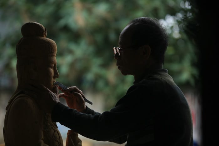 Some rules govern these statues’ creation. The length of the face should be half the width of the shoulder. The thigh bones should be one quarter the length of the statue’s overall height. The funny gatekeepers are short in order to emphasize their respectful kowtowing to the deities. Rounded shapes and stocky figures symbolize jolly amusement. The two gatekeepers have two different smiles. One laughs out loud, while the other tries to hold back his laughter. “The pair depicts one fearful gatekeeper and one bold one. Their two smiles represent yin and yang,” explained the craftsman Hoang Van Sam, whose family has carved wooden statues for eight generations.