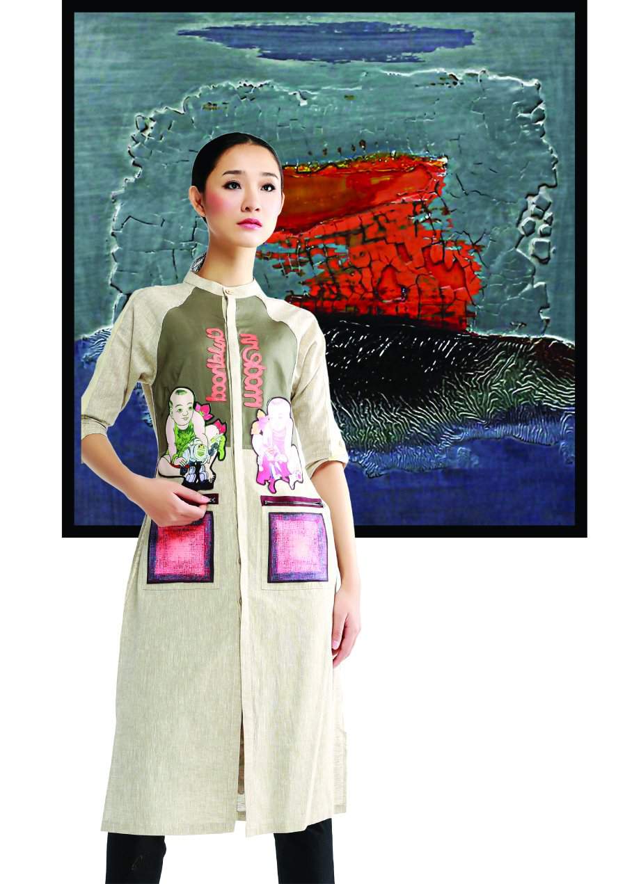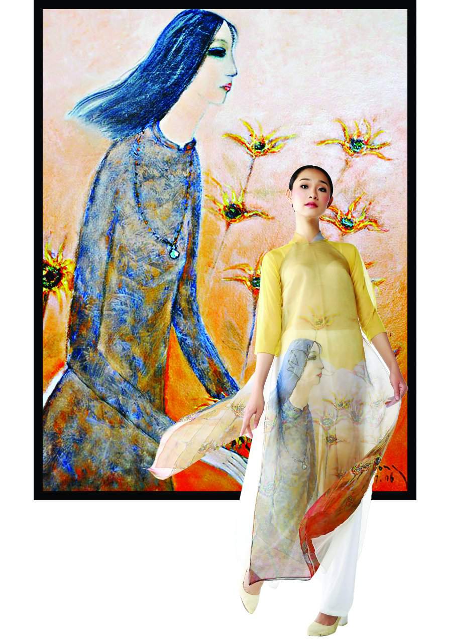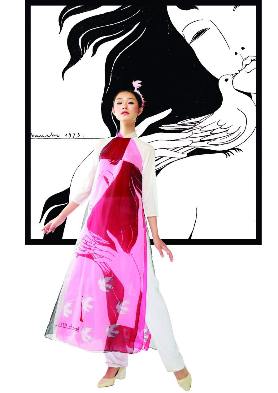 Portraits of traditional Hue ladies, paintings of lotuses and lilies and landscapes of the Perfume River and Ngu Mountain were some of the subjects adapted to the áo dài. A set of dove paintings by Buu Chi in 1973 to demonstrate a desire for peace and a collection of paintings by artist Dinh Cuong that portrayed the grace of Hue maidens were adapted by designer Minh Hanh on her impressive collection. Her unique designs were contemporary but faithful to the timeless beauty of the áo dài, wearable both on the catwalk and on special occasion in everyday life.