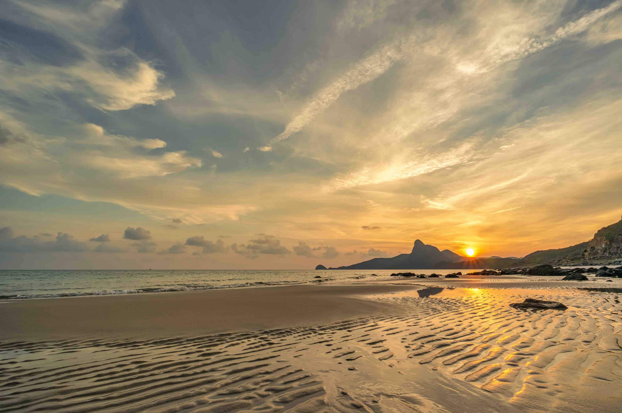 Located closer to the center of Con Dao, along the stunning coastal road that stretches from Cua Tu to Mui Ca Map (Shark Cape), Nhat Beach is a hidden gem. This place is perfect not only for couples who come to admire Love Peak but also for solo travelers who can enjoy a date with the stunning sunrise and sunset. From Shark Cape, one can admire the silhouette of the hill beside Nhat Beach, resembling a couple sitting by the sea, hence the name Love Peak. When the tide recedes at Nhat Beach, it reveals a vast expanse of rocks of various sizes and shapes. As the water rises, it creates white foam that reflects the famous blue hues of Con Dao’s sky.