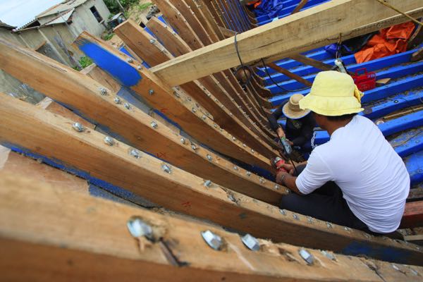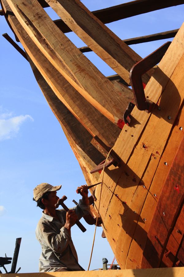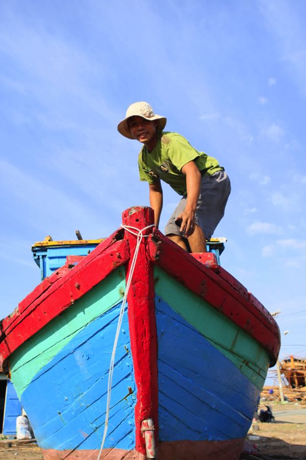 With simple tools like axes, saws, chisels and drills, the craftsmen Phu Dong produce quality vessels that can remain at sea for a month before heading ashore. While most of the labor intensive jobs are performed by men, women perform the crucial step of planing of bamboo into fibers to seal the boat’s timbers. The bamboo fibers are mixed with Cay Dau Rai oil and ground clam shells and pressed between boards to ensure that the boat is waterproof. In the past, Avicennia sap was also used to make the boat more solid.