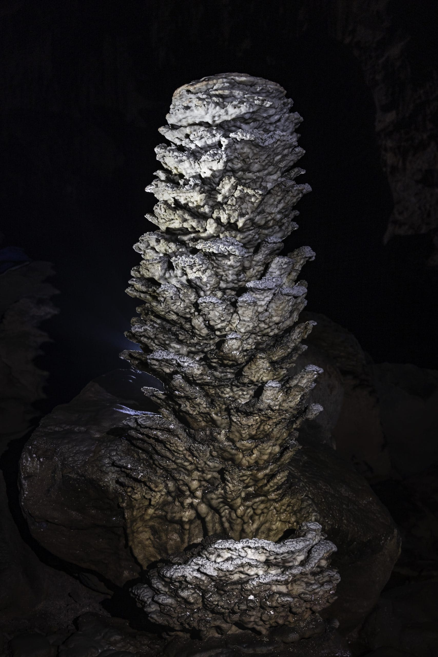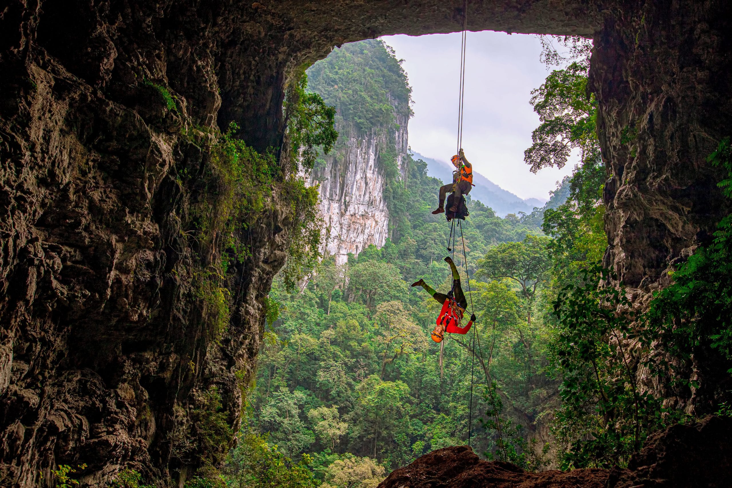 The cave’s first lower entrance is via an underground river that originates in the valleys of the Ruc Ca Roong region. The water flows through the entrance and reaches a spectacular exit – the Kong Collapse. We had to swim 300m along the pitch-black underground river, in temperatures of 17-18 degrees Celsius, with only a small headlamp for illumination. It was a spine-tingling experience that would surely thrill even the most daring adventurers. After conquering the underground river, our crew reached the Kong Collapse. One of the tallest sinkholes in the world, Kong Collapse is as tall as 450m from top to bottom and contains many surprises. It is aptly named for its shape, similar to the enormous head of King Kong when seen from the top. The sinkhole is known not only for its peculiar shape surrounded by rocky mountains but also for its underground river and primitive forest, making it an ideal campsite.
