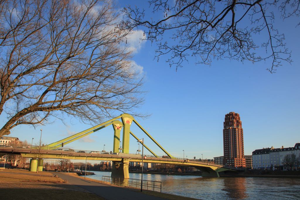 This special bridge was built at an angle of around 70 degrees between the two ends. It is also the only traffic bridge in Frankfurt to have but a single tower, which stands 21.5m high and is heavily skewed to the right. The bridge was built in 1984 and spans 221m. Designed by Egon Jux, this bridge triggered heated controversy due to its asymmetry and single high tower. Since the bridge spans two contrasting currents in the river, with an island on the left, the right of the bridge must withstand more pressure. The bridge was built 70 degrees diagonally to the main current, so that its only tower could be planted where more strength was needed. The team succeeded in creating an extremely rare skewed bridge.