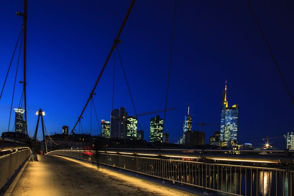 Built in 1990 as part of the master plan to connect the downtown with museums in the Sachsenhausen District, this footbridge is a favorite with Frankfurters. The bridge measures 210m long and 4m wide. It boasts two A-shaped blue towers that hold two red cables woven with angled grey blue cables. The bridge is lit up at night. Holsteinberg is the contemporary answer to the old Eiserner Steg. From the city’s downtown it is now easy to reach Stadel Museum, one of the most important art museums in Germany. Works by the revered German painter Hans Holbein, one of the greatest portrait painters of the 16th century, may be found here. Holbein was also known for his religious stained glass. This bridge was named after him.