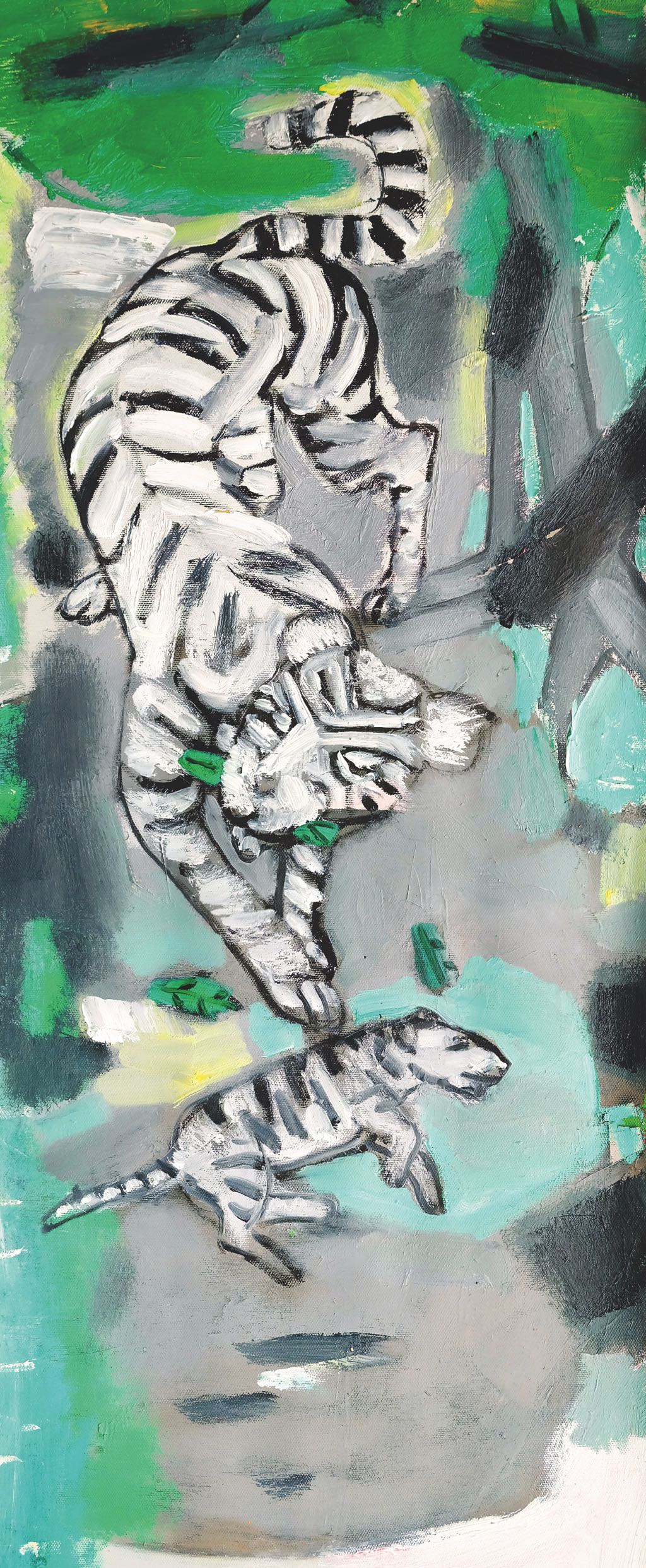 Fearing tigers, he rushed over and axed the cubs to death, but at just that moment, the mother tiger returned. Hearing her terrible roar, Cuoi dropped his axe and climbed a tall tree. Watching from on high, he saw the mother tiger’s fury at her offsprings’ demise.