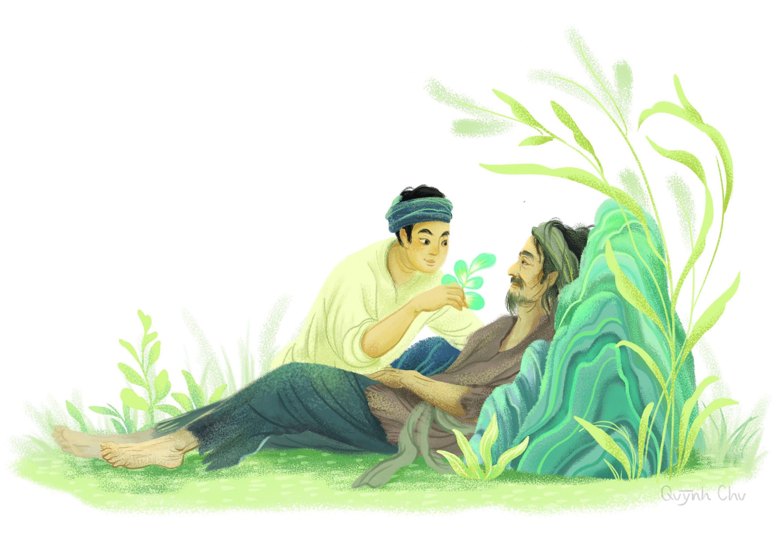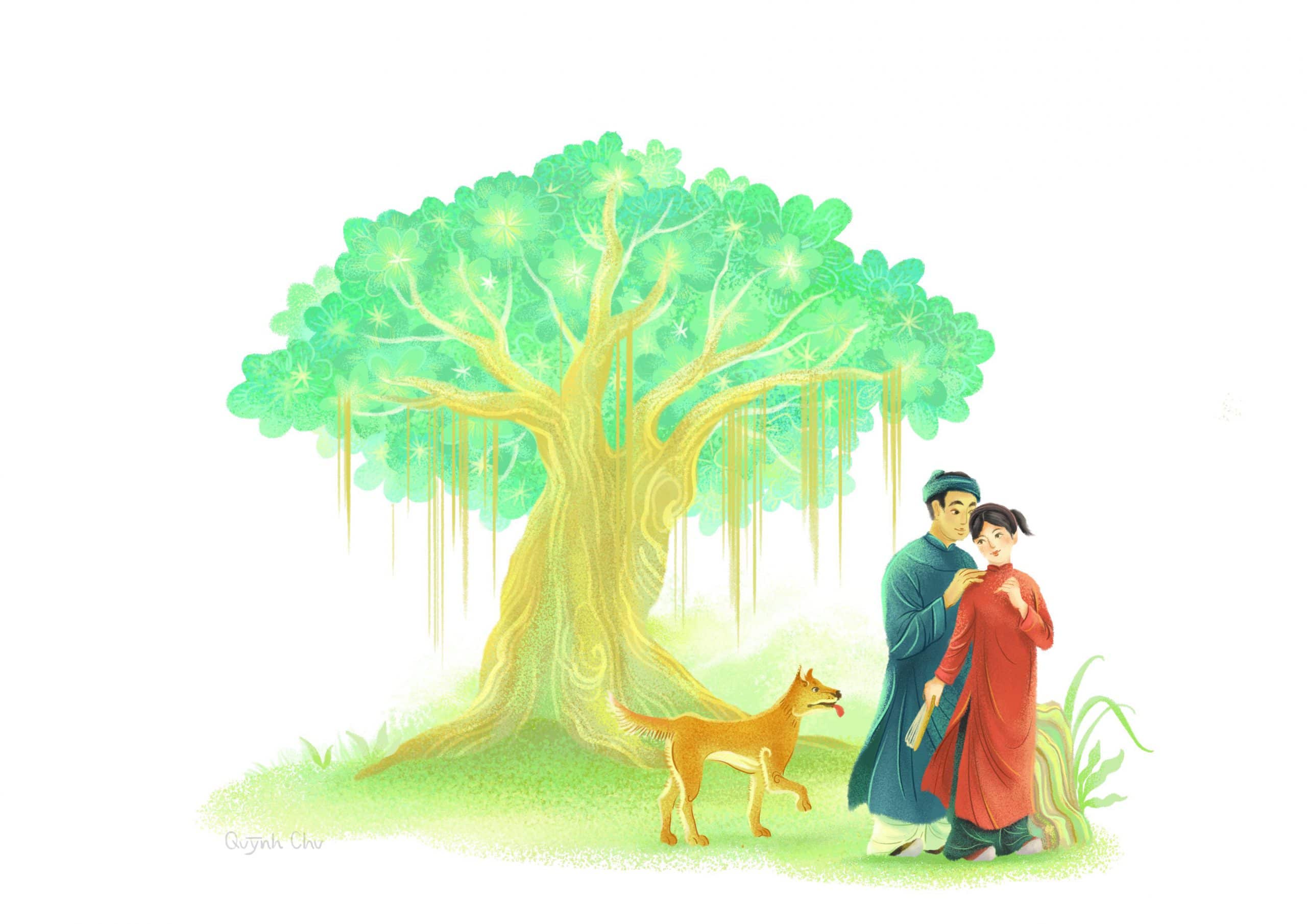 Cuoi used his tree’s medicinal leaves to revive many people. If anyone in the area passed away, he used the leaves to help them. Word of Cuoi and his magical tree spread far and wide. One day, Cuoi waded across a river and saw a drowned dog. He salvaged it and brought the dog back to life. The clever dog became Cuoi’s loyal companion. Another day, a wealthy man from the neighboring village rushed to Cuoi and begged him to revive his daughter, who had drowned. Cuoi willingly followed the man home and revived the girl. In the blink of an eye, the pale maiden was brought back to life. Seeing Cuoi as her savior, she offered to marry him. The wealthy father happily helped Cuoi to win her hand in marriage. The couple lived peacefully and happily.