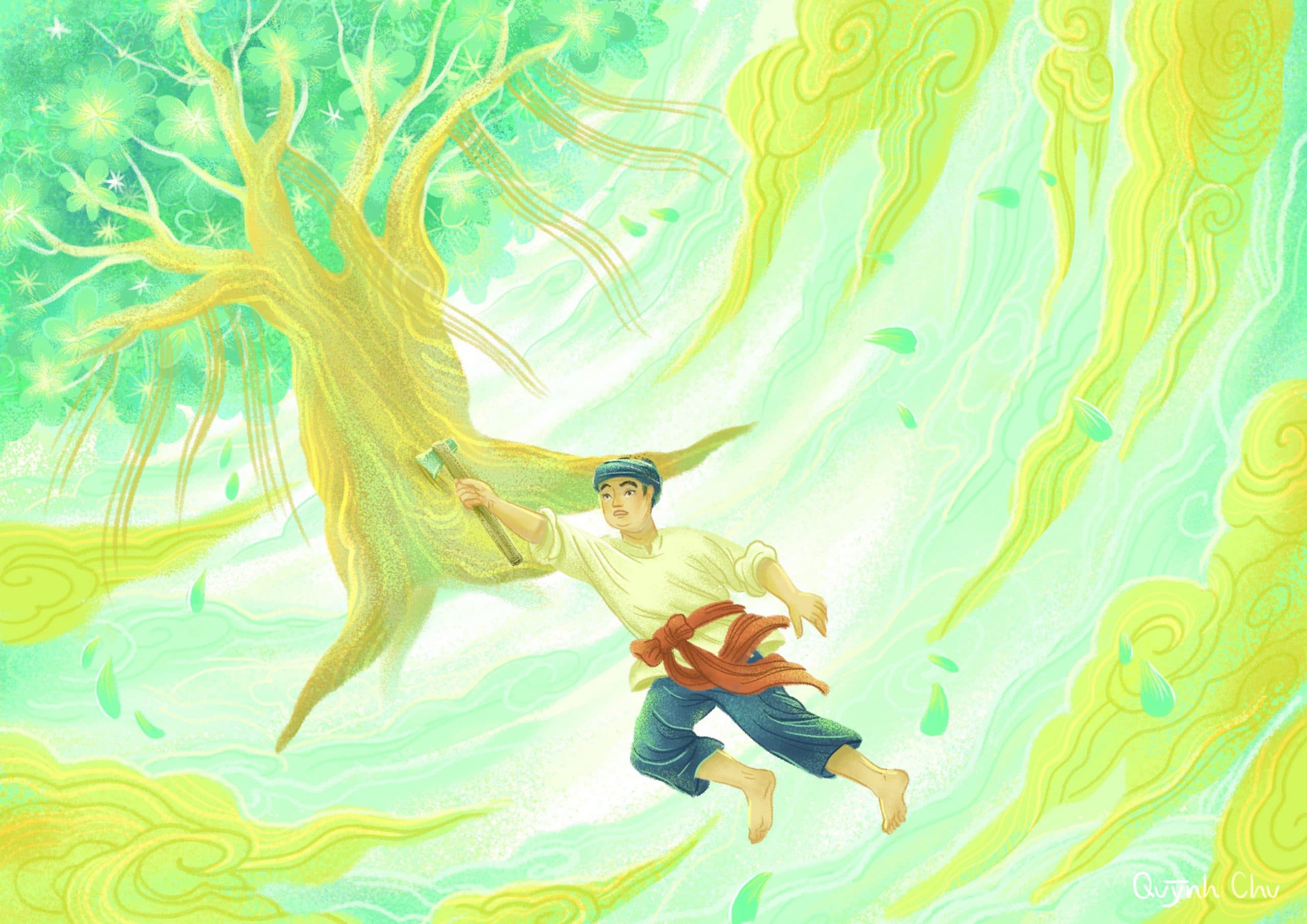 Suddenly, the ground shook. Nearing home, Cuoi saw the tree’s branches flail and heard the wind roar. He watched in astonishment as the banyan tree rose slowly into the sky. He dropped his firewood and raced after it. But the banyan tree was already overhead. Cuoi managed to hook his axe to a root in an attempt to pull the tree back but nothing could hold it back. The banyan tree flew higher and higher, pulling Cuoi into the sky. It landed on the moon and took root.