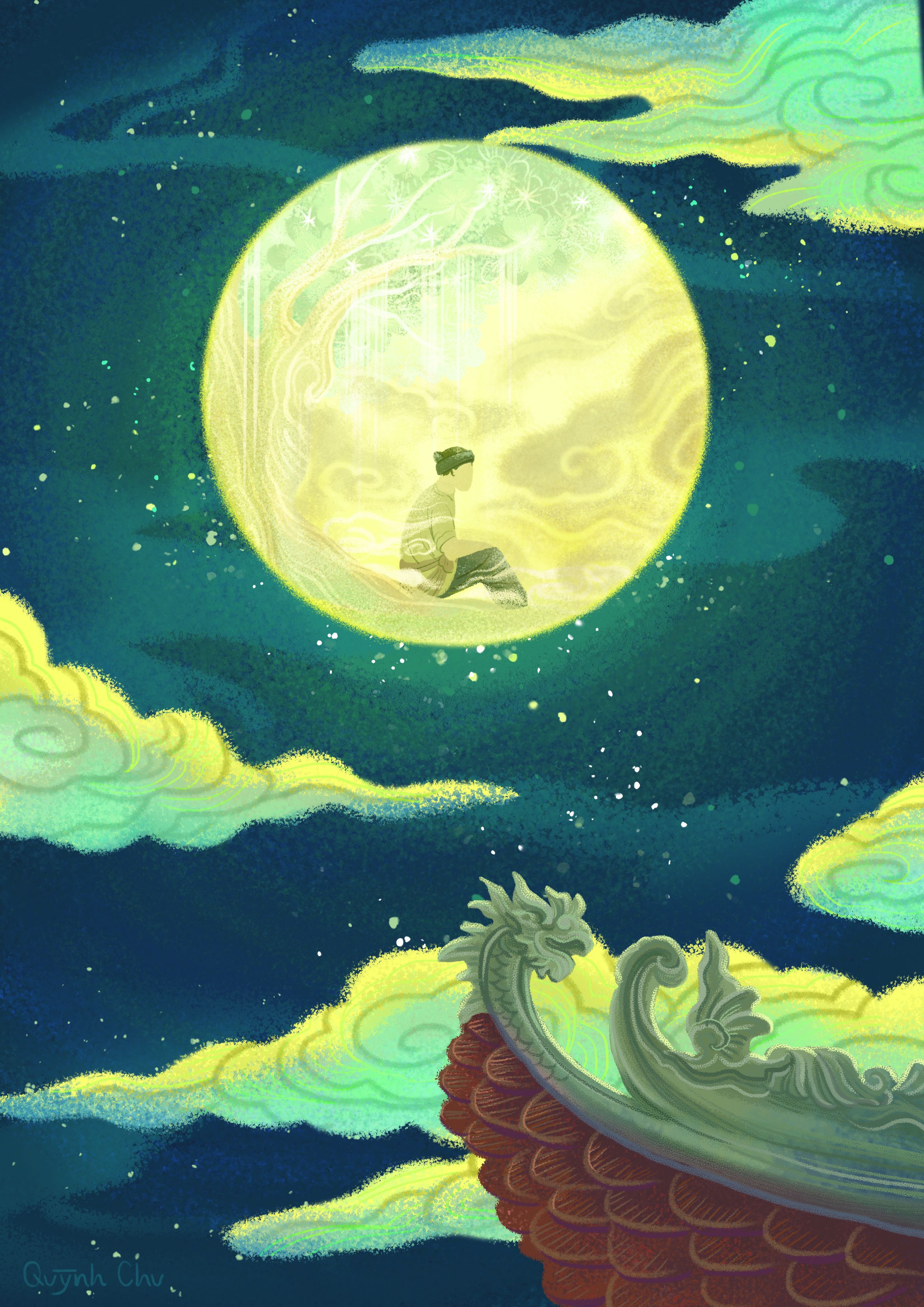 Since then Cuoi remained on the moon with his banyan tree. Look at the moon and you will see the sharp black silhouette of a tree with a man sitting beneath it. This is Cuoi sitting beneath his banyan.