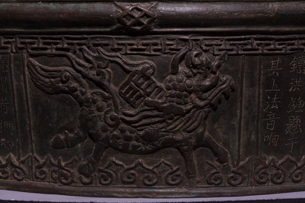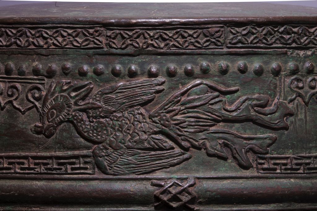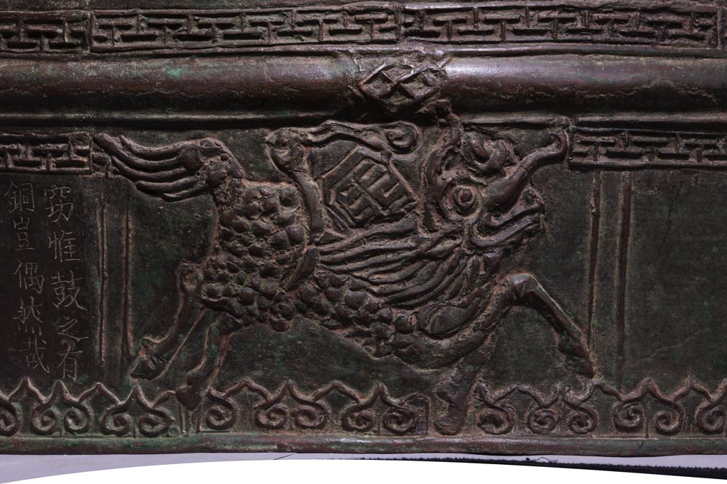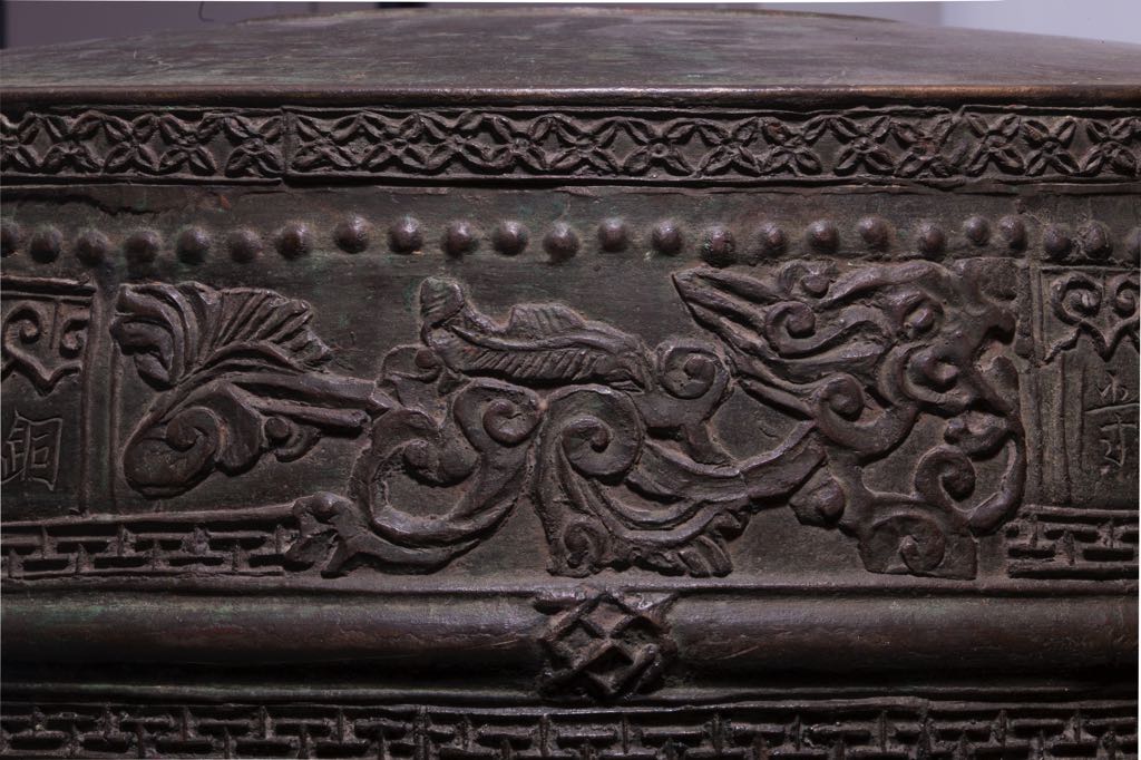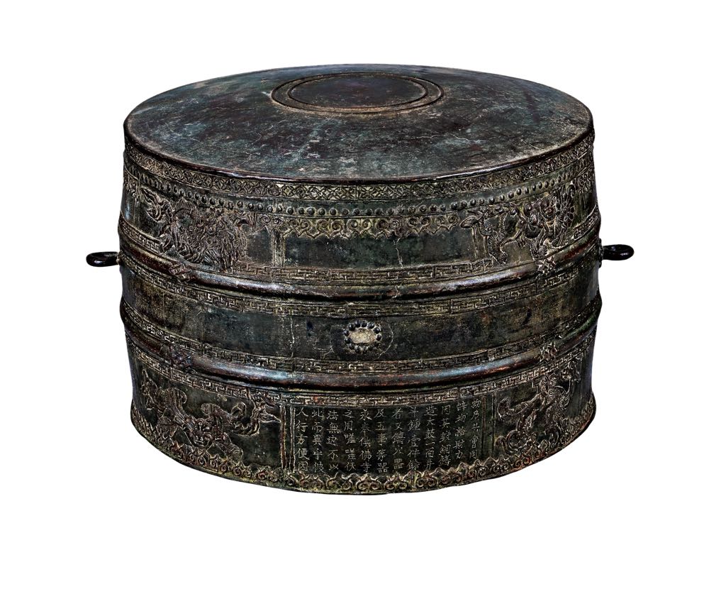 The drum’s form and decorative motifs are typical of its era. The designs are symmetrical and masculine. The Four Sacred Animals, the Dragon Horse and the Sacred Tortoise appeared individually in ancient Vietnamese arts. However, their inclusion as a set of four or two (comprised of the Dragon Horse and Sacred Tortoise carrying the He Map and Luo Chart) heralds the beginning of a new artistic era that endured into the Nguyen Dynasty (1802 – 1945).